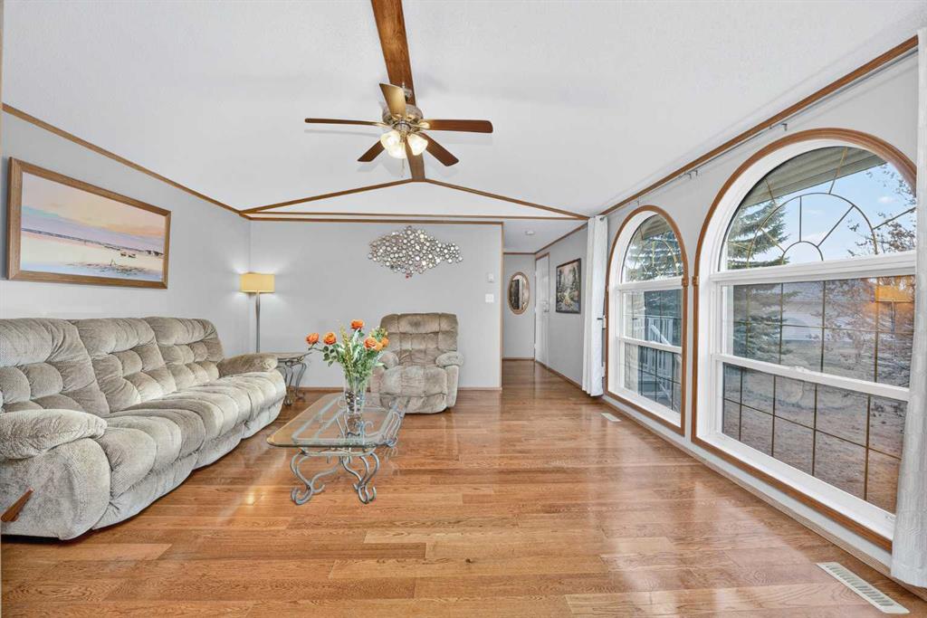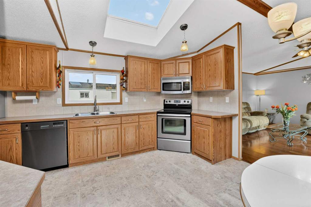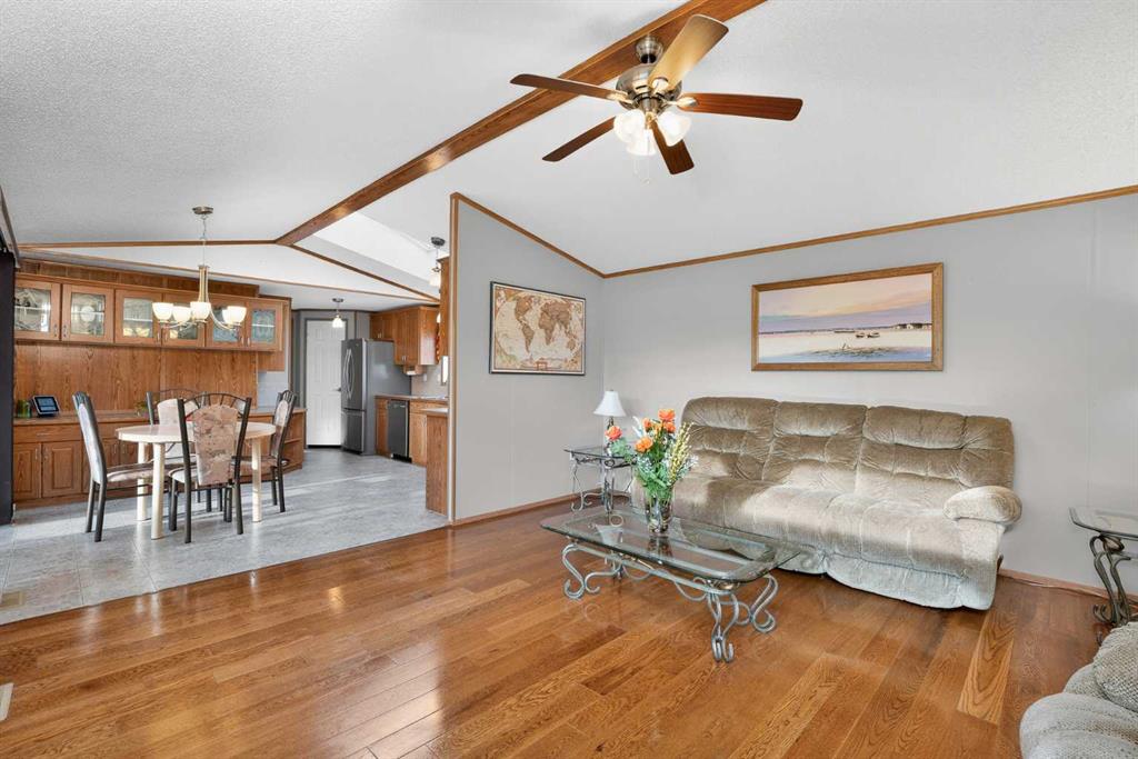 Located in Strathmore’s Ranch Estates, a premier adult living community. This well-maintained 3-bedroom, 2 full-bath home, including an ensuite walk-in shower and walk-in closet, offers comfortable, low-maintenance living, with landscaping included in the park fees. The open-concept design features a bright kitchen area with stainless steel appliances and a skylight. It flows seamlessly into an inviting, bright living space accented with hardwood flooring and large windows with shutters—step outside to a spacious west-facing covered deck with rolling shades and a gas BBQ—perfect for entertaining guests. Practical highlights include an insulated garage finished with drywall, an attached workshop, and a 6\' x 8\' garden shed for additional storage. Recent exterior updates include the roof and eavestroughs. Located near many amenities like shopping, restaurants, walking paths and Kinsmen Park—an excellent opportunity for buyers seeking convenience, comfort, and a community-focused lifestyle.