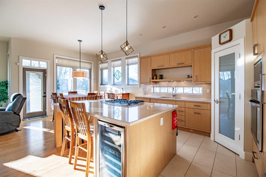 Welcome to this exceptional executive bungalow in the highly sought-after community of Fieldstone Way, where timeless design meets everyday family living. Perfectly positioned on a large pie-shaped lot backing onto green space and a peaceful walking path, this former Tahoma Homes show home showcases the craftsmanship and elevated finishes this locally respected builder is known for. From the moment you step inside, the 11-foot ceilings and expansive windows create a sense of light and openness. The main floor offers a warm yet refined atmosphere, featuring rich hardwood floors and an inviting family room anchored by a stunning stone gas fireplace with custom built-in shelving — the perfect place to gather after a long day. The open-concept layout flows seamlessly into the dining area, bathed in natural light, and into a beautifully appointed kitchen designed for both entertaining and everyday life. Highlights include a large island ideal for family breakfasts or hosting guests, custom cabinetry, and a new wall oven — all thoughtfully designed to blend function and elegance. With three spacious bedrooms on the main level, this home is ideal for growing families or those who value single-level living. The primary suite is a true retreat, offering a generous walk-in closet and a luxurious 5-piece ensuite designed for relaxation. A well-appointed 4-piece bathroom serves the additional main floor bedrooms. Downstairs, 9-foot ceilings enhance the already expansive feel of the fully developed lower level. Here you’ll find two additional bedrooms, a 4-piece bathroom, and a large open family room complete with a wet bar — perfect for movie nights, entertaining friends, or creating a comfortable space for teens and guests. The oversized garage provides ample space for vehicles, storage, and all the extras that come with an active lifestyle.