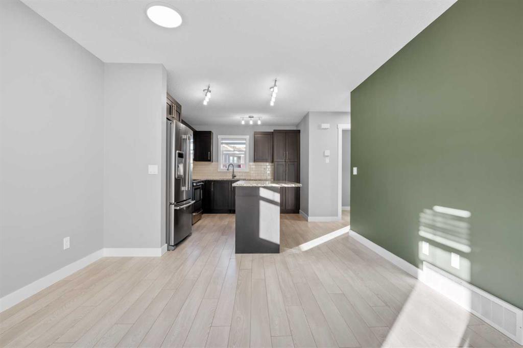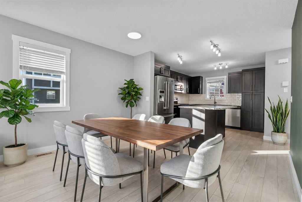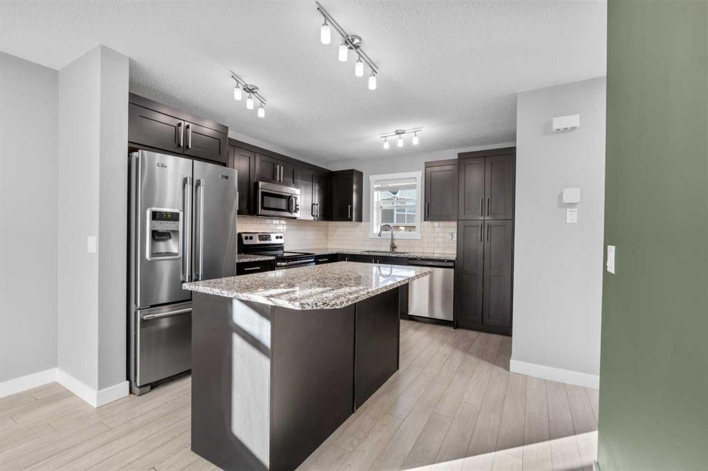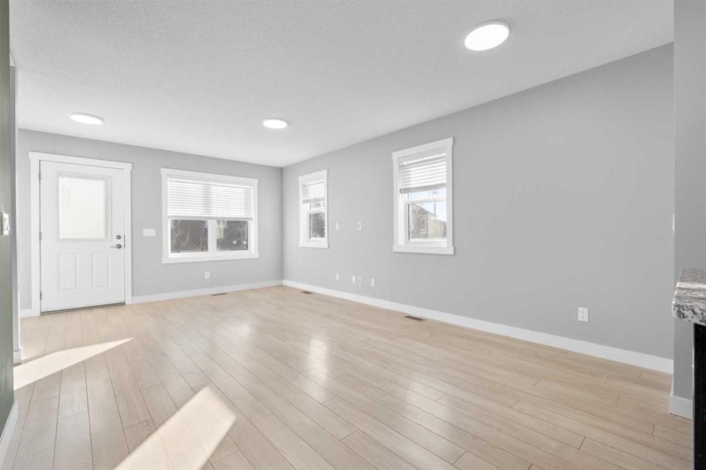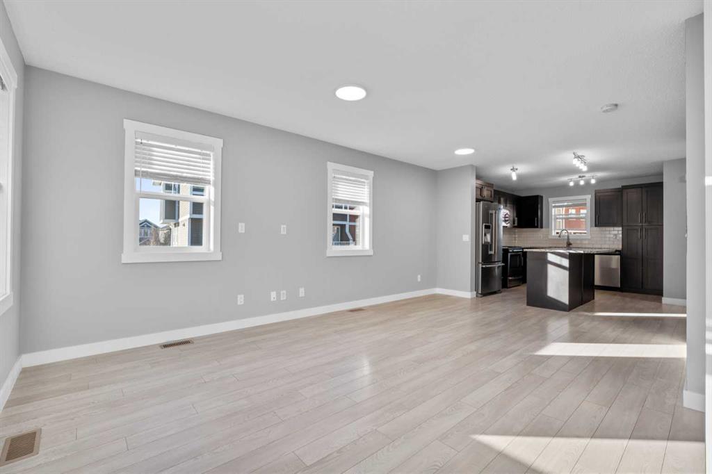 Hello Airdrie! Welcome to this immaculately maintained END UNIT is truly the one you\'ve been waiting for! Freshly painted and professionally cleaned, this bright and inviting home features spectacular windows, modern flooring and new light fixtures throughout the main floor. With an open-concept layout where the kitchen, dining, and family room flow seamlessly together, creating the perfect space for both everyday living and entertaining. Upstairs, you\'ll find a versatile flex area ideal for a home office or play space, a spacious secondary bedroom and full bathroom, a convenient upper-floor laundry, and a generous primary retreat complete with its own ensuite. Enjoy outdoor living with both a lower patio and upper deck, plus the added bonus of an oversized single attached garage and driveway for extra parking and storage. Situated in a quiet, well-managed complex offering a community gazebo and ample visitor parking, this home is surrounded by parks, scenic pathways around the ponds, bike paths and a pump track, and is just minutes from shopping and quick access to 40th Avenue for easy commuting. This is an exceptional opportunity to own a beautifully cared-for home in one of Airdries most fantastic communities.