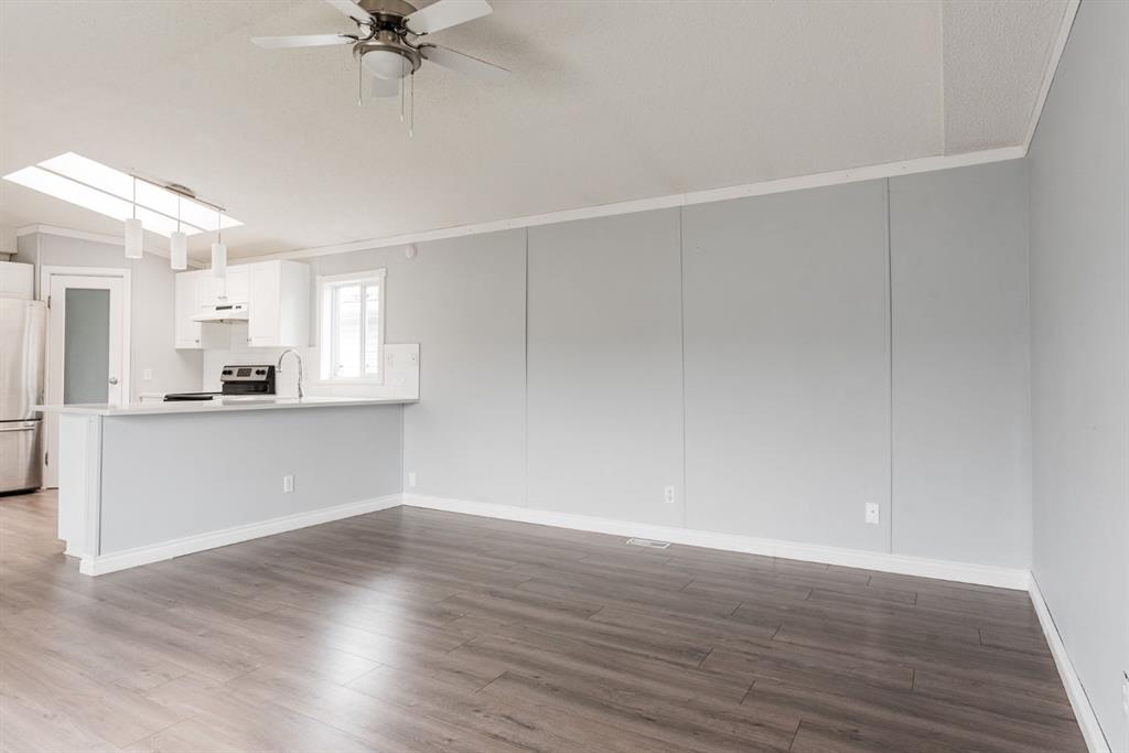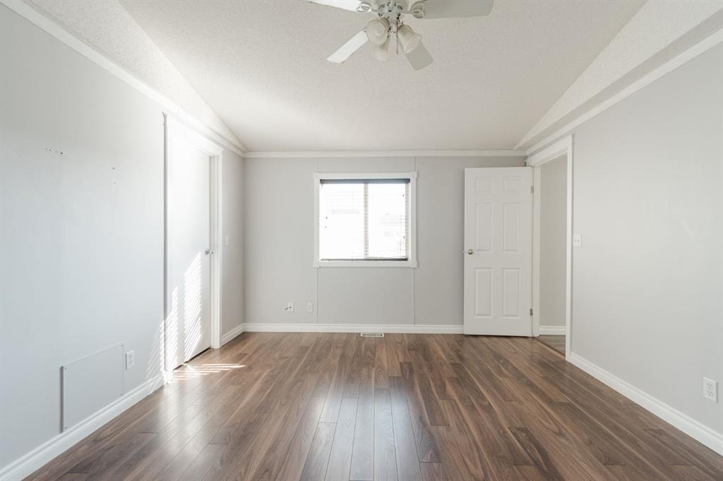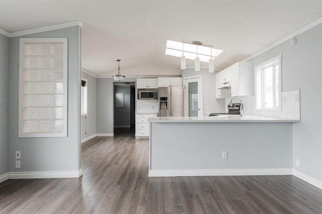 The open-concept living room is spacious and filled with natural light, featuring stylish grey walls that enhance the modern aesthetic. Down the hall, you\'ll find the primary bedroom, complete with a large walk-in closet and a full four piece ensuite bathroom. On the opposite end of the home are two additional bedrooms, including one oversized room with two windows and two closets, providing ample space and versatility. A second four piece bathroom is conveniently located between these bedrooms, and both bathrooms feature matching white vanities that complement the kitchen cabinetry.