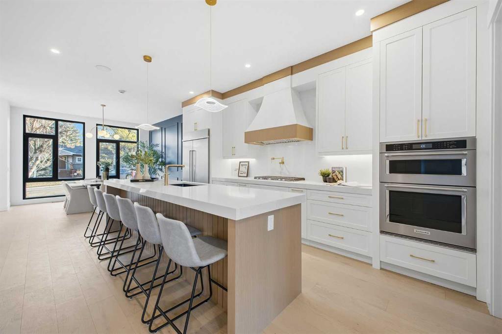 The main floor impresses with soaring 10-foot ceilings, wide-plank engineered hardwood flooring, and 8-foot doors. The gourmet kitchen features quartz countertops, a gas stove, built-in microwave, hood fan, custom cabinetry, a walk-in pantry, and a large island with breakfast bar seating. A formal dining area and a cozy living room with gas fireplace and built-in millwork complete this elegant open-concept space. A stylish powder room with designer lighting and custom vanity adds to the home\'s appeal.