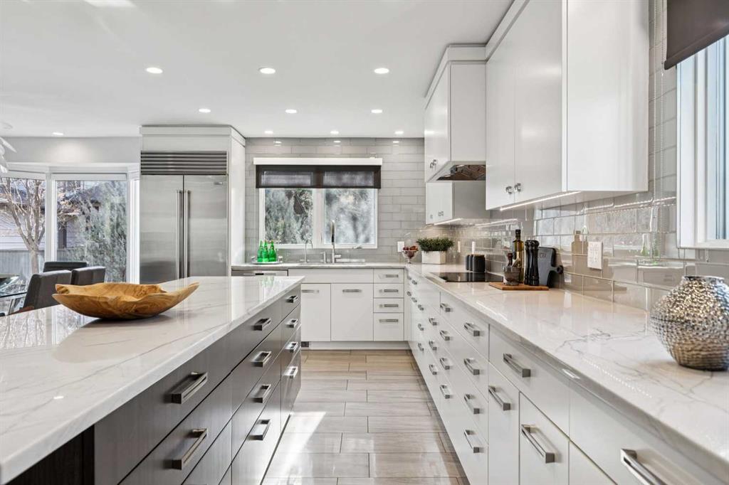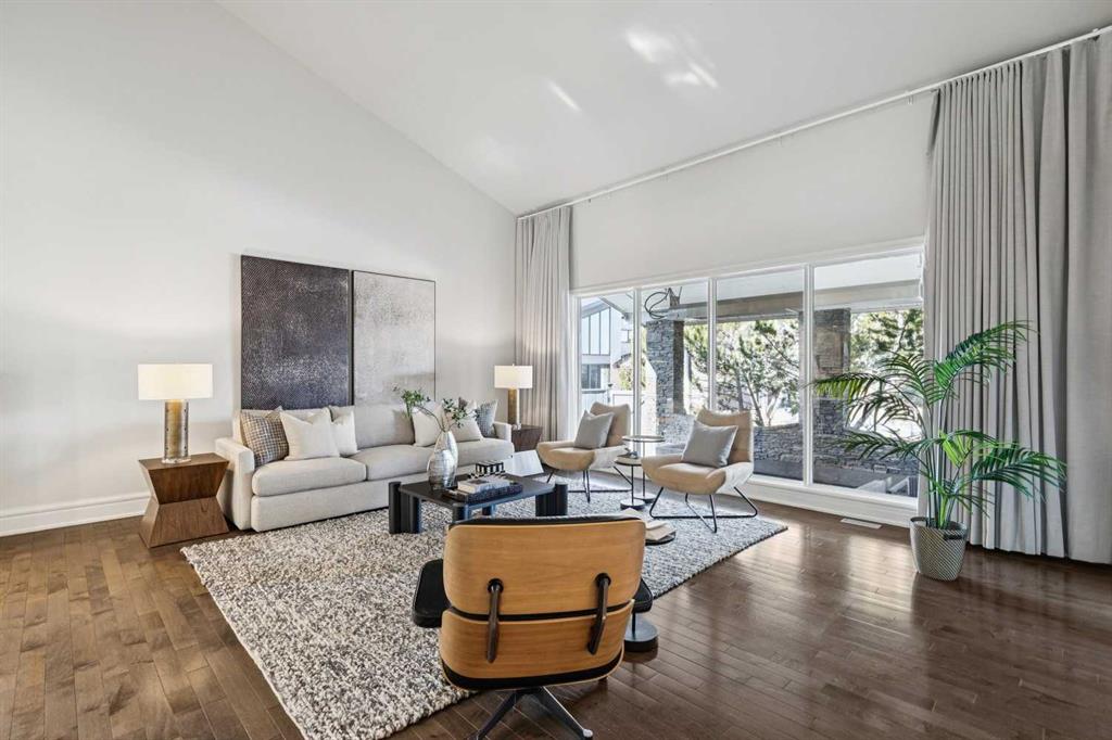 Bright + beautifully renovated executive family home with pleasing curb appeal, highlighted by a large covered front patio complete with heater — perfect for enjoying the outdoors year-round. This home shows beautifully + offers a warm, welcoming entrance that opens to a spacious living room with soaring ceilings + a huge picture window that fills the space with natural light. The chef’s kitchen is designed for both everyday living + entertaining, featuring abundant cabinetry + counter space, professional stainless steel appliances, a large island with seating + a generous informal dining area. Just steps down is the comfortable family room with a striking stone feature wall, gas fireplace, built-in shelving + wall-mounted TV. Oversized patio doors lead directly to the landscaped backyard. Upstairs you’ll find three well-sized bedrooms, convenient laundry + a family bath, along with a fantastic primary retreat. The primary bedroom is exceptionally spacious, offering extensive ample closing space, a spa-inspired ensuite + a huge private deck. The fully developed lower level adds even more living space with a large recreation room, bathroom with full steam room, guest bedroom + excellent storage. The big backyard is ideal for play + entertaining, complete with a fire pit. Additional highlights include fresh neutral paint, hardwood flooring, stylish light fixtures, lush carpeting + a double attached garage. Ideally located close to off-leash areas, parks, schools, Rockyview hospital + all amenities.