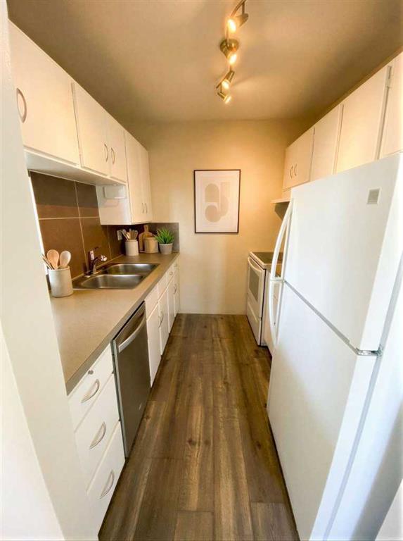 The open-concept floorplan creates a bright, functional living space with seamless flow between the kitchen, dining, and living areas. A new dishwasher adds everyday convenience, while in-suite laundry and additional in-unit storage enhance comfort and efficiency. Step outside to your large east-facing balcony — the perfect spot for morning coffee — complete with extra exterior storage for seasonal items.