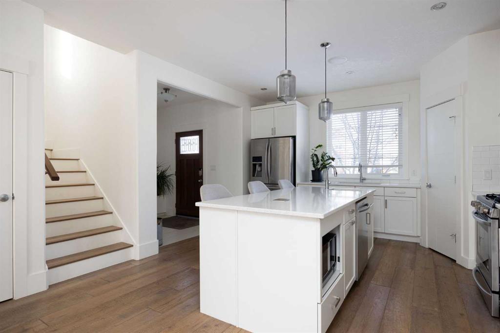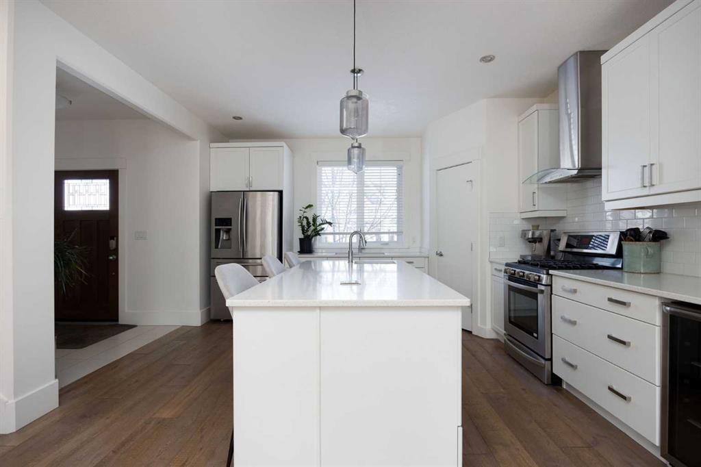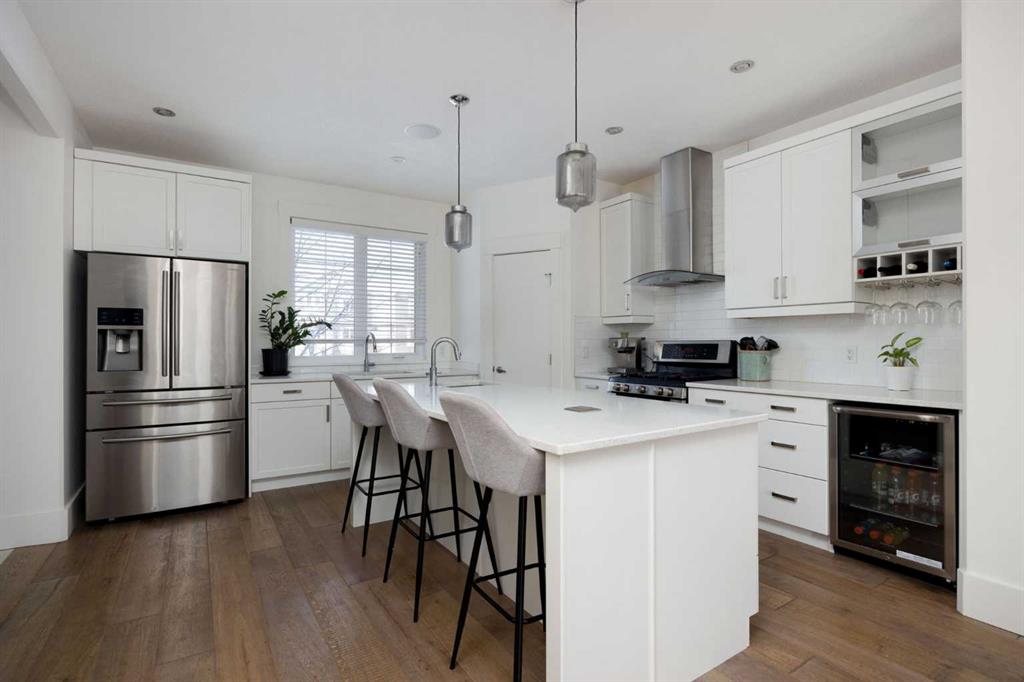 From the moment you step inside, you will notice the gorgeous hardwood floors and thoughtful design throughout. The white, full-height kitchen is the showpiece of the main floor, featuring quartz countertops, subway-tile backsplash, wine fridge, pantry, gas stove, and a spacious island with breakfast bar and secondary prep sink. The open-concept dining and living room create the perfect space for entertaining, anchored by a stunning linear gas fireplace and beautiful wood mantle. A coordinating barn door leads to the back entry, where you will find convenient laundry facilities and a two-piece powder room.