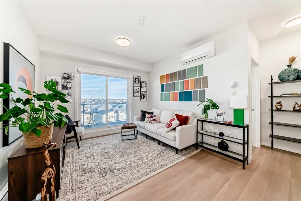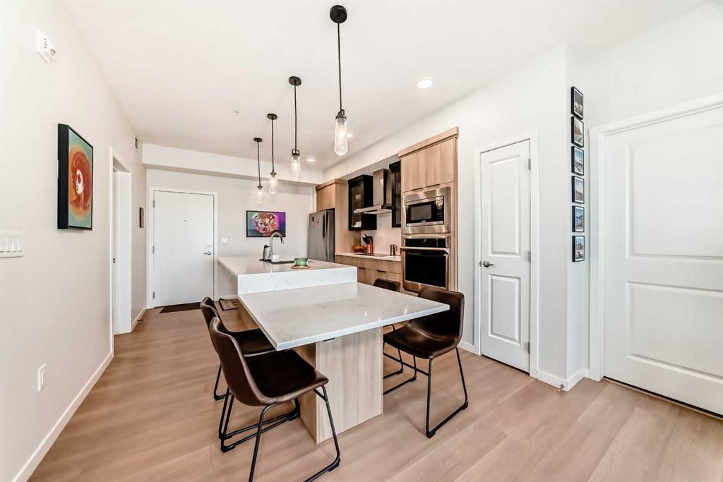 If you have been searching for a modern condo in NW Calgary that does not feel cookie-cutter, this is it. Located in Carrington, this TOP-FLOOR home gives you privacy, light, and a clean contemporary design. Built in 2022 by Cedarglen, this 860+ sqft condo was designed for real life. Not just photos. The kitchen is upgraded and finished with TWO-TONE CABINETS to the ceiling, GLASS-FRONT UPPERS, QUARTZ COUNTERS, a BUILT-IN OVEN and microwave, a cooktop with HOOD FAN and a CUSTOM BUILT-IN DINING area. It feels sleek, modern, and intentional, perfect for hosting. This 2 BED / 2 BATH layout offers separation and function. The primary bedroom has an ensuite with DOUBLE VANITY, walk-in shower and a massive WALK-IN CLOSET. The second bedroom has its own WALK-IN CLOSET too, and is adjacent to the guest bath. The huge LAUNDRY ROOM offers serious storage. You also get A/C, titled underground PARKING and a separate STORAGE LOCKER. No sweating in the summer. No scraping snow in winter. No clutter in your living space. TOP FLOOR means no one above you. More peace. More quiet. Nearby GREENWAY PARK offers playgrounds, a basketball court, a skate park, art installations, and access to the Rotary Mattamy Greenway trail system. In fact, there are about 65 acres of green space and connected pathways making it easy to stay active. The SHOPS OF CARRINGTON GREEN, with groceries, restaurants, and professional services, are literally at your doorstep. Quick routes to major roadways and future Green Line LRT expansion make commuting simple. Stop settling for average condos. This one checks all the boxes.