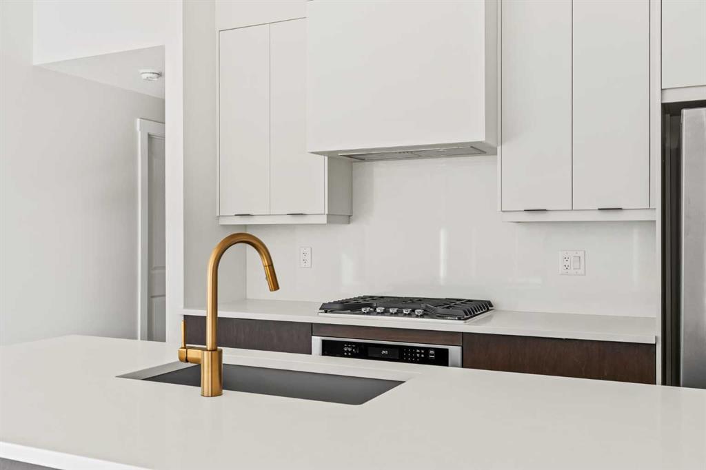 The Hyde at Crown Park offers true single-level living without compromise and represents one of the final opportunities to own a brand-new bungalow-style townhome in this highly sought-after community. Featuring 3 bedrooms, 2 bathrooms, and nearly 1,400 sq.ft. on one level, plus a private double attached garage and exceptional storage, this home is perfectly suited for those looking to downsize while keeping the space and functionality they’re accustomed to. Ideally positioned in the heart of Crown Park, the residence features a southwest-facing balcony overlooking the central park and is located just minutes from downtown Calgary - combining maintenance-free living with an inner-city lifestyle. The main living space is beautifully designed for everyday comfort and effortless entertaining. A timeless white kitchen anchors the home, opening seamlessly to the living and dining areas while a full wall of southwest-facing windows fills the space with natural light. The kitchen showcases quartz countertops, a warm wood accent island, and a premium built-in appliance package including a gas cooktop and built-in oven. The expansive living room features a striking floor-to-ceiling tiled fireplace and comfortably accommodates gatherings with ample seating space for 6+ people, while the generous dining area easily hosts a table for eight - perfect for family dinners and entertaining. Privately positioned at one end of the home, the primary retreat is thoughtfully separated from the secondary bedrooms by the laundry area, enhancing privacy. The suite includes a large walk-in closet and a spa-inspired ensuite with dual vanities and a walk-in shower with 10mm glass surround. Two additional bedrooms offer flexible use as guest space, a home office, or media room and are served by a full bathroom. A spacious laundry room with additional cabinetry and folding counter adds everyday convenience. Outdoor living is equally impressive with an approximately 26’ x 8’ covered southwest-facing balcony overlooking the park and complete with a gas line, hose bib, and A/C rough-in - maximizing sunlight year-round both inside and out! The lower level provides access to the oversized private double attached garage along with two large storage areas, offering the extra space rarely found in bungalow-style living. Located within Calgary’s newest inner-city community, this brand-new home delivers a true lock-and-leave lifestyle and includes full builder warranty plus Alberta New Home Warranty. Rarely do single-level townhomes with private double garages become available - this is your chance to secure a low-maintenance bungalow lifestyle without sacrificing space, location, or comfort. This brand new opportunity is one of the very last opportunities available at his exceptional master-planned inner-city development - don\'t wait!