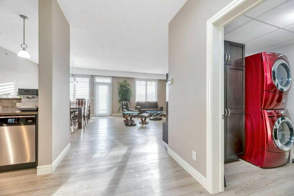 Enjoy quiet living with no unit above and a spectacular two-storey, south-facing balcony designed to capture warm sunshine, making it perfect for entertaining and summer barbecues. Ideally situated along the edge of Fish Creek Provincial Park, this award-winning complex offers direct access to miles of scenic walking, hiking, and cycling pathways, creating a true nature-lover’s retreat. This immaculate two-bedroom plus den, two-bathroom home features soaring 9-foot ceilings and a thoughtfully designed open-concept layout enhanced by upgraded laminate flooring and new plush carpeting throughout. The spacious foyer leads into a beautifully appointed gourmet kitchen complete with granite countertops, abundant espresso cabinetry, deep drawers, a corner pantry, and premium stainless-steel appliances including a Miele induction range, Miele dishwasher, and a French-door refrigerator with water and ice maker. The expansive living and dining areas are flooded with natural light from the sunny south exposure and seamlessly extend to the oversized balcony, creating an exceptional indoor-outdoor living experience. The primary suite offers a peaceful retreat with a walk-in closet and a four-piece ensuite featuring double sinks. A generously sized second bedroom is conveniently located beside the main four-piece bath. Both bedrooms showcase new top-grade carpeting and custom organizers. The dedicated den provides excellent built-in cabinetry, making it ideal for a home office or hobby space. In-suite laundry with a Maytag washer and dryer, central air conditioning, and condo fees that include all utilities add everyday comfort and convenience. This unit includes two titled, adjacent heated underground parking stalls and two secure storage lockers just steps from the elevator. Thoughtfully updated and meticulously maintained, recent improvements include ceiling fans in both bedrooms, custom cabinetry and high-end closet organizers, a retractable screen door, updated lighting in the den and kitchen, a new shower door in the main bath, makeup mirrors in both bathrooms, and a programmable thermostat. Sanderson Ridge is renowned for its exceptional resort-style amenities, including a swimming pool, hot tub, steam room, fitness centre, bowling alley, movie theatre, woodworking shop, craft room, wine cellar, billiards room, and two car wash bays. Bright, spacious, and move-in ready, this home offers an unparalleled lifestyle in one of Calgary’s most sought-after adult communities. Welcome home!
