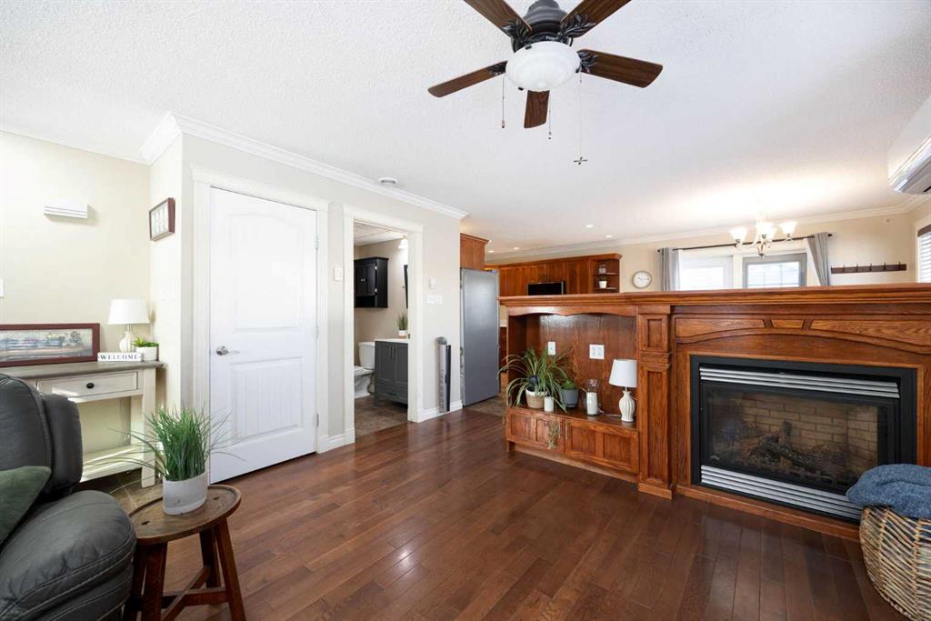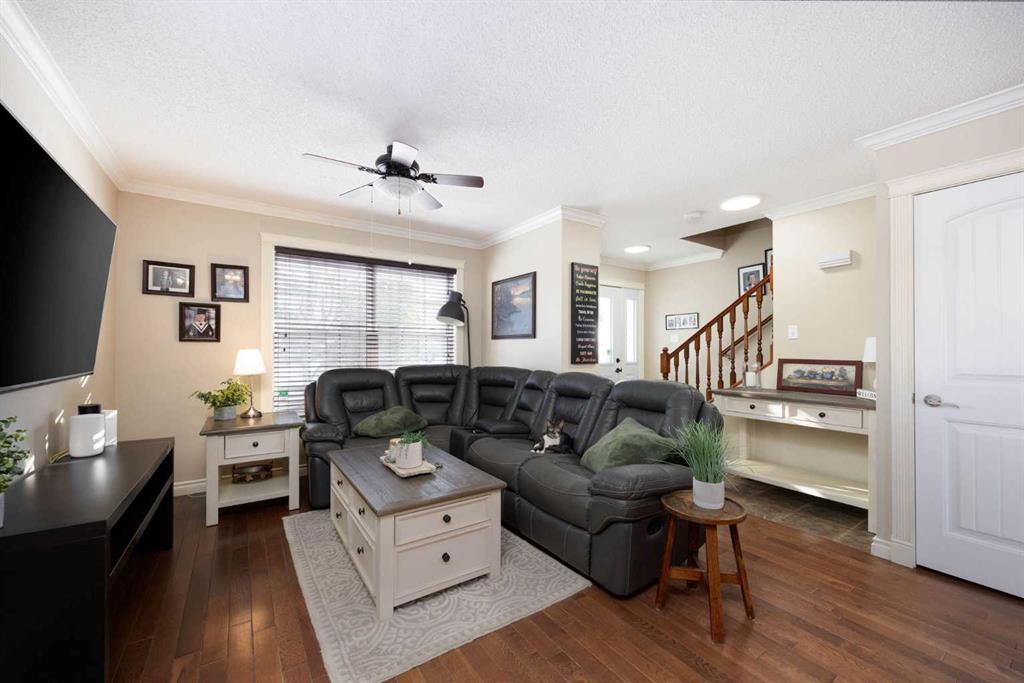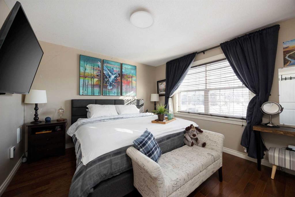 Step inside to a bright and inviting main level finished entirely in hardwood with no carpet in sight, creating a seamless and timeless feel. The kitchen is both functional and beautiful with rich wood cabinetry complemented by a brand new white quartz countertop installed in 2025, updated black fixtures in 2025, a new dishwasher, microwave and sink completed in 2025, plus a fridge and stove replaced in 2016. The adjacent dining area offers an eat up bar that overlooks the living room, making it the perfect place for morning coffee, homework sessions or hosting friends. A cozy gas fireplace gently defines the space between kitchen, dining and living areas while still maintaining that open, connected feel everyone loves. The main level also includes a convenient two piece powder room, infloor heat for added comfort and a heat pump with air conditioning wall unit installed in 2022 to keep things comfortable year round.