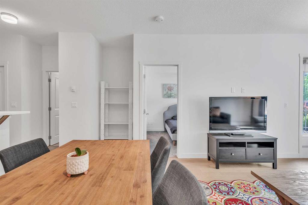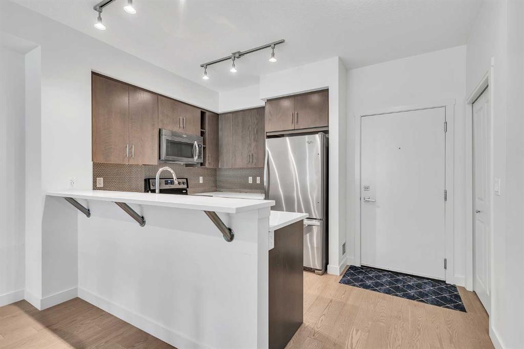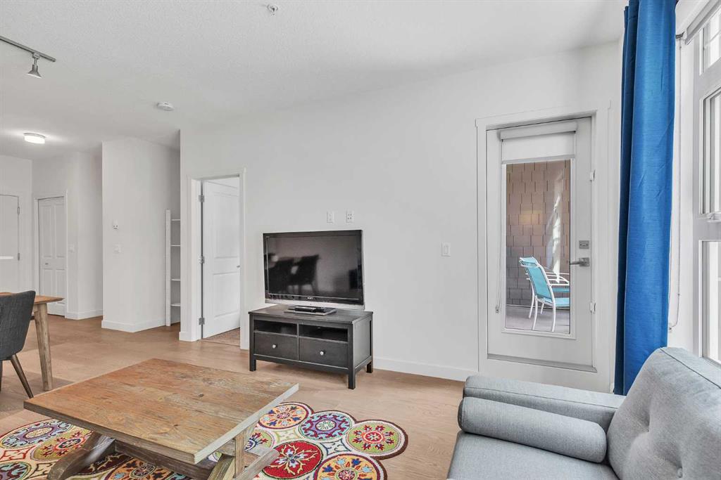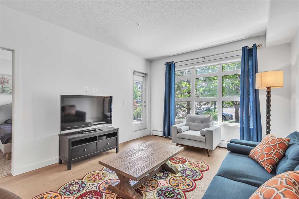 This beautifully appointed 1-bedroom, 1-bathroom west-facing condominium offers exceptional value at an affordable price. Boasting a spacious kitchen complete with soft close drawers, quartz countertops, s/s appliances, and breakfast bar. The great-sized bedroom provides ample space for rest and relaxation, with a walk-through closet and cheater door to the bathroom. The main living space offers gorgeous hardwood floors, newly added air conditioning, upgraded blinds package, big windows for plenty of natural light and large dining and living rooms. There is a covered patio off the living room with BBQ gas line and west exposure for afternoon/evening sun. A titled undergound parking stall is included and there is a storage locker for your extra gear. This home is ideally situated close to the lake and has easy access to public transportation, as well as major roadways such as Deerfoot and Stoney, making commuting a breeze. Nearby shopping, dining, and entertainment options abound, making this the perfect home for first-time buyers, investors, or downsizers looking for a comfortable and convenient lifestyle. Call today to arrange your showing!