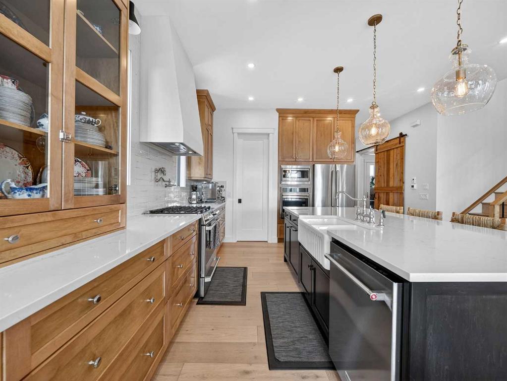 Welcome to an extraordinary custom-built farmhouse in the prestigious community of Wedderburn in Okotoks — a residence where refined craftsmanship meets timeless country elegance. From the moment you arrive, the home’s striking curb appeal, architectural charm, and warm, inviting presence create an unforgettable first impression. A gracious and spacious foyer welcomes you inside, immediately setting the tone for the thoughtful design carried throughout. Just off the entry, a beautifully appointed office offers both functionality and sophistication, complete with bespoke built-in cabinetry and a custom desk. As you continue into the heart of the home, the breathtaking kitchen unfolds in true European Tuscan farmhouse style. Floor-to-ceiling custom maple cabinetry, rich in detail and warmth, is perfectly complemented by white oak flooring that flows seamlessly throughout the main level. A generous central island anchors the space, while a statement custom hood fan, built-in appliances, and exquisite imported tile elevate the design. Expansive windows capture sweeping west-facing mountain views and southern vistas overlooking Okotoks. The adjoining dining and living areas are designed for both intimate evenings and elegant entertaining. A custom gas fireplace provides warmth and ambiance, while an abundance of windows invites natural light and frames the stunning landscape beyond. Completing the main floor is a thoughtfully designed mudroom featuring custom cabinetry and a pristine dog bath. Ascending to the upper level, you are welcomed by a stunning bonus room perfectly positioned to take full advantage of the south-facing views over Okotoks and the majestic Rocky Mountains to the west. Three spacious bedrooms offer comfort and refinement. The primary retreat is a sanctuary unto itself, showcasing a spa-inspired ensuite with dual vanities, a freestanding soaking tub, and an oversized custom walk-in shower. Two additional bedrooms share a beautifully appointed bathroom. The laundry room is exceptional — custom cabinetry and farmhouse sink create a space as beautiful as it is functional. The fully developed lower level elevates this home even further. In addition to a completely separate legal basement suite with its own private entrance, quartz countertops, stainless steel appliances, and stacking washer and dryer — the lower level also features an additional bedroom or multifunction room with a full private ensuite. Bright, airy, and finished to the same uncompromising standards as the upper levels, nothing has been overlooked. Outdoors, the property truly shines. Situated on one of the largest lots in Wedderburn, the expansive south-facing backyard offers endless opportunity for relaxation and recreation. A two-tiered deck with pergola creates the perfect setting for summer evenings, entertaining, and enjoying the open skies. Every detail of this residence has been meticulously curated, the epitome of luxury farmhouse living.