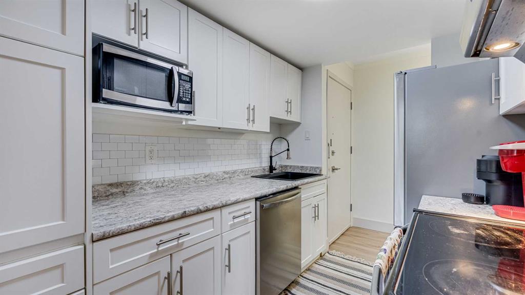 The spacious floor plan features an inviting oversized living room, a dining area, and a private balcony. The updated kitchen showcases white cabinetry, subway tile backsplash, stainless steel appliances, and ample storage.