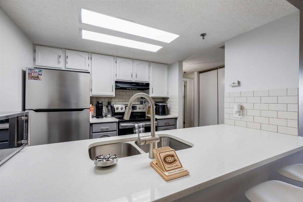 GREAT UNIT, STEPS FROM THE UNIVERSITY! Welcome to this beautiful, light, bright and spacious two-bedroom apartment on the 4th floor of Laureate Place. Located within a walking distance of the University of Calgary, Foothills Hospital, Children\'s Hospital, and C-Train, this prime location provides unparalleled convenience and ample services. From your private balcony you can enjoy spectacular views of Calgary’s downtown skyline, beautiful sunrises and sunsets. Enter this immaculate unit and you will find fresh paint and newer vinyl flooring throughout. This unit features two full size bedrooms, two 4-piece bathrooms with quartz counter tops, spacious kitchen with upgraded quartz countertop and a big central island, an open concept dining and living room. A generous size laundry room provides a good space for your storage needs, plus one heated underground parking is included. Refrigerator, washer and dryer 2022, paint and lights 2023. This apartment is the perfect choice for students, professionals, investors, and those seeking to be part of Calgary\'s finest community!