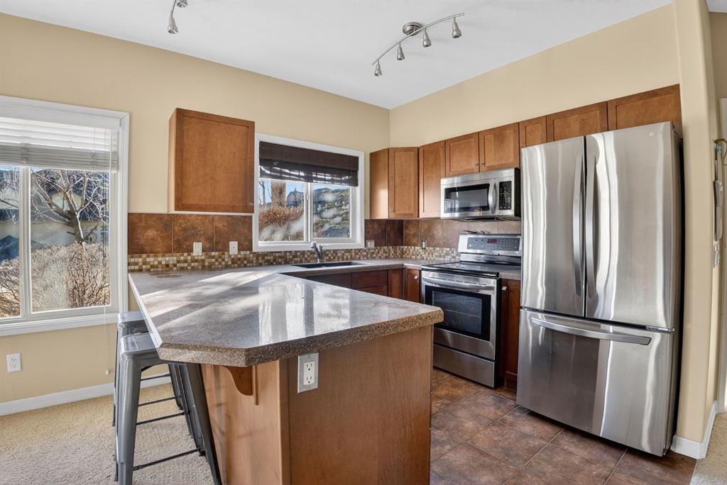 Welcome to this ground-floor corner unit in the heart of Okotoks, offering the perfect blend of comfort, convenience, and lifestyle. With 921 sq ft of thoughtfully designed living space, 9’ ceilings, and an abundance of natural light, this 2-bedroom condo feels open, bright, and inviting from the moment you step inside. The functional layout seamlessly connects the kitchen, dining, and living areas, creating an ideal space for both everyday living and entertaining. The kitchen features stainless steel appliances, ample cabinetry, and generous counter space, making meal prep effortless. Large windows enhance the airy feel while the corner-unit location provides added privacy and extra light. The spacious primary bedroom offers plenty of room to unwind, while the second bedroom is perfect for guests, a home office, or additional family space. Enjoy the convenience of in-suite laundry and ample storage throughout. One of the standout features of this home is the rare offering of TWO titled parking stalls — a valuable bonus for couples or guests. Step outside and embrace the lifestyle that makes this community so desirable. With lake access included, you can enjoy year-round recreation right at your doorstep. The building’s amenities further elevate your living experience, featuring a fully equipped gym, steam room, hot tub, and an entertainment/lounge area perfect for hosting or relaxing.