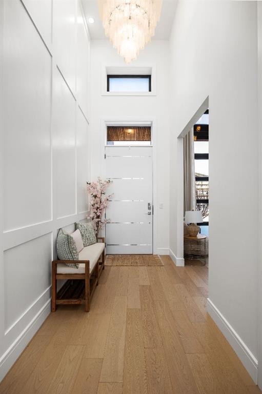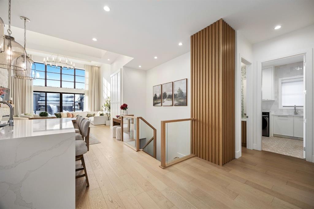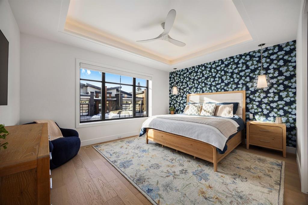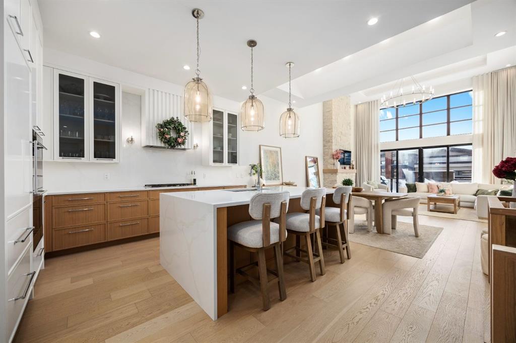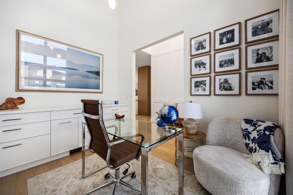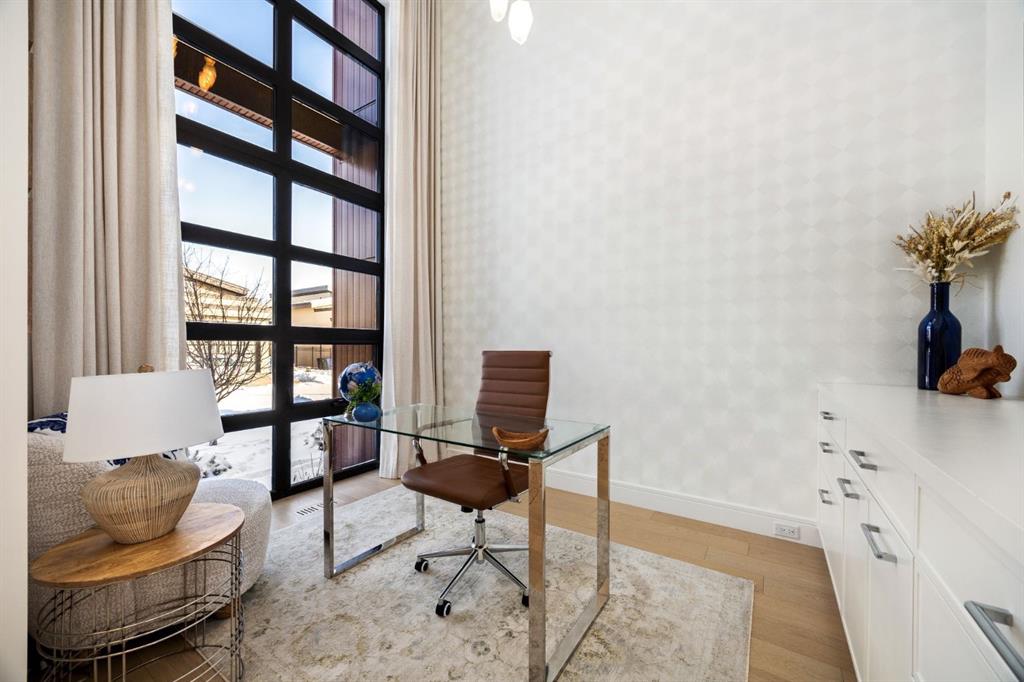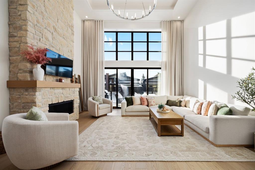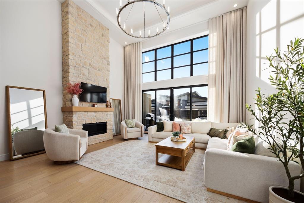 Introducing a rare offering in the sold out luxury bungalow community of Elveden Court on Calgary’s coveted west side, made up of only 26 units. This refined residence represents the pinnacle of lock-and-leave living, designed for discerning homeowners who appreciate exquisite craftsmanship paired with the ease of a low-maintenance, lock and leave lifestyle. This unit is elegantly finished with tile, flooring, millwork, wallpaper and stone upgrades from an already elevated build quality to create a serene, warm and inviting atmosphere. Builder owned, rest assured, every detail has been carefully executed! The open-concept main level is warm and inviting, with light oak hardwood flooring, soaring ceilings, ample skylights and expansive windows that flood the entire living space with natural light. A striking hand built stone fireplace anchors the great room under 16’ ceilings, while large doors open to a west facing patio with a built-in gas fireplace, perfect for indoor-outdoor entertaining. The kitchen is a true showpiece, appointed with a premium Wolf & Sub-Zero appliance package. Custom cabinetry including an enhanced walk up pantry design is complemented by an upgraded quartz backsplash and a waterfall island creating both visual impact and exceptional functionality. The main level primary suite offers a tranquil retreat, featuring a spacious bedroom, walk-in dressing room, and a spa-inspired ensuite with in-floor heat, upgraded tile selections, dual vanities, a freestanding soaker tub, and an oversized 10mm glass shower. Custom, elegantly exciting wallpaper feature walls adorn many of the tranquil spaces throughout the home. A beautifully appointed den with custom millwork, a powder room and a well appointed laundry area complete the main floor. The fully developed walk-up level with 9’ ceilings is designed for entertaining and lifestyle flexibility. A spacious recreation area is highlighted by an upgraded gas fireplace and a wet bar. Two additional bedrooms with custom closets and a full three-piece bath provide ideal accommodation for guests or older children. This lower level also has a thoughtfully upgraded home gym, and additional storage in the mechanical room. The oversized double attached garage features a heated slab, epoxy flooring, transom windows for natural light, and a custom storage mezzanine. Built to an exceptional standard, the home was constructed with full Insulated Concrete Forms (ICF) to the soffit line, including the party wall, delivering superior thermal efficiency, sound attenuation, and long-term durability. Triple-glazed windows and skylights enhance comfort and natural light further exemplifying the quality of construction. Minutes to Aspen Landing, Westside Recreation Centre, Stoney Trail, and the Rocky Mountains, this villa community offers an un offers an unparalleled blend of privacy, quality, and convenience.