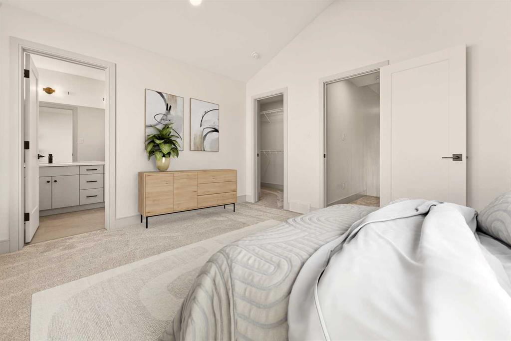 Upstairs, you’ll find the laundry conveniently located near the private primary retreat. The primary bedroom continues the vaulted ceiling design and features another oversized window, enhancing the sense of space and light. The ensuite is finished with dual vanities, a walk-in shower, and an impressive 11-foot-long walk-in closet that provides plenty of storage without compromise.