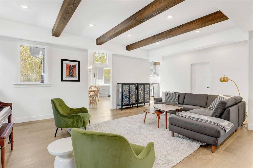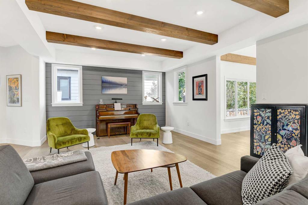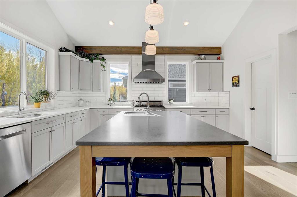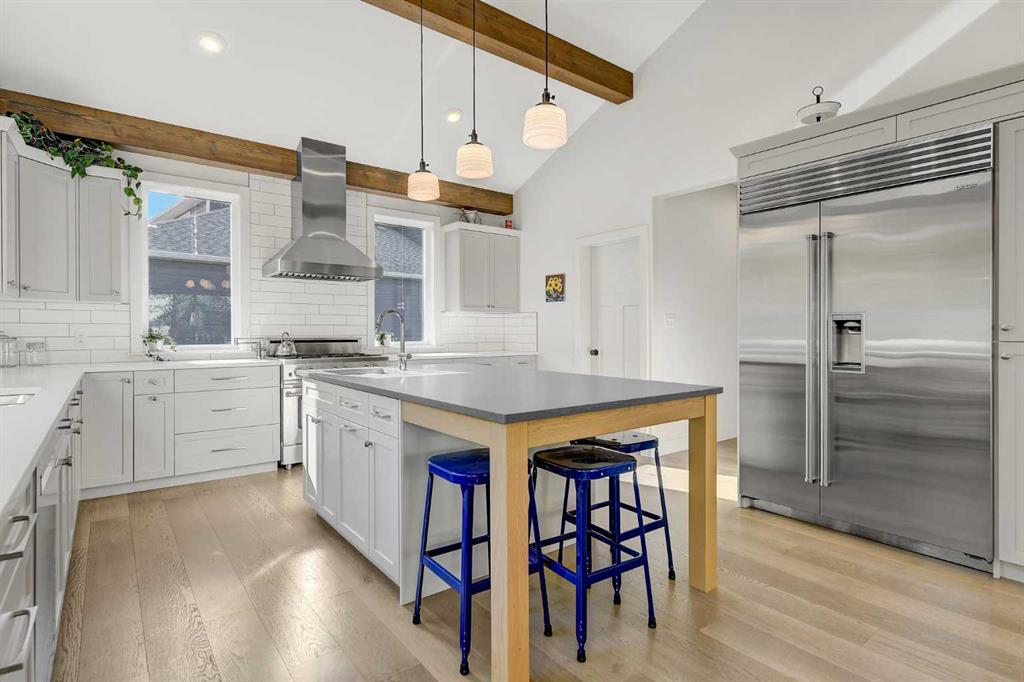 Step inside and experience a home where every detail tells a story of craftsmanship and care. The home features engineered hardwood, custom tile and luxury laminate throughout, creating a seamless flow of warmth and sophistication. The vaulted kitchen ceiling, adorned with striking timber beams, anchors the heart of the home. This chef’s kitchen features a $50,000 appliance package including a Sub-Zero refrigerator, Bluestar range, and commercial-grade hood vent, complemented by custom lighting, premium hardware, and timeless finishes.