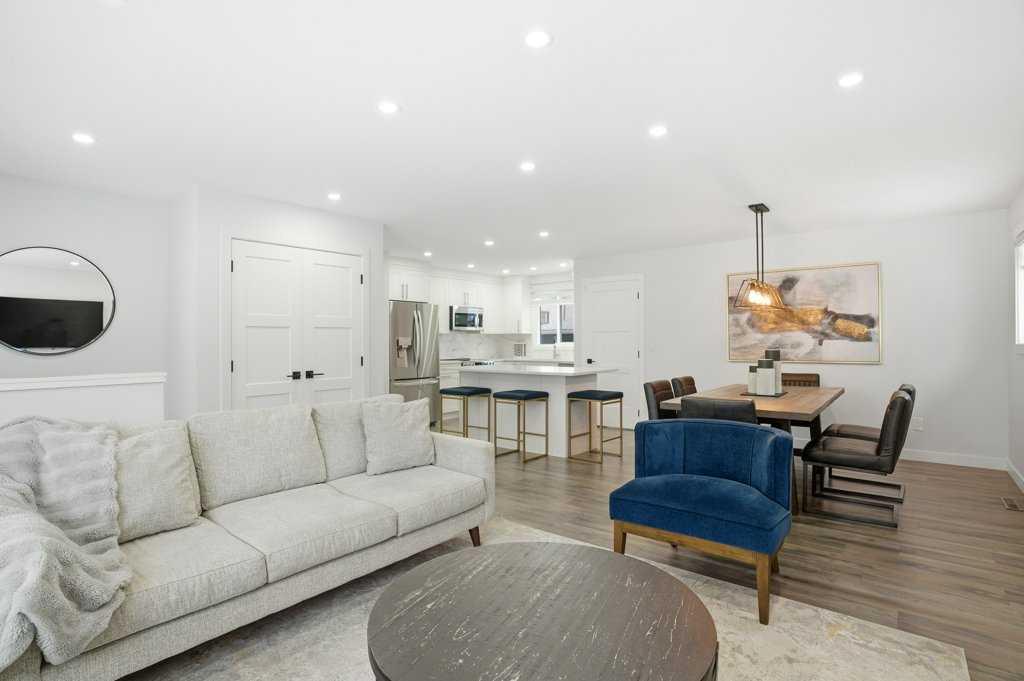 Renovated detached homes in established inner-city southwest Calgary are increasingly difficult to find. Especially beautifully RENOVATED homes on CORNER LOTS this well connected. FINISHED DOUBLE GARAGE | 2 LAUNDRY ROOMS | 2 BEDROOM ILLEGAL BASEMENT SUITE | CENTRAL AC | SOUTH BACKYARD w/ UNDERGROUND SPRINKLER SYSTEM | AGGREGATE BACKYARD PATIO | ACROSS FROM PLAYGROUND & OUTDOOR RINK | This gorgeous bungalow offers an open floor plan creating seamless flow for everyday living. Large windows bathe the living room in natural light while added pot lights ensure warm, even illumination into the evening. Designer lighting defines the large dining space, elevating both casual meals and larger gatherings. At the centre of it all, the chef’s kitchen impresses with quartz countertops, stainless steel appliances, full-height cabinetry and a large island that invites connection over morning coffees or evening conversations. Neutral tones throughout provide a timeless backdrop that complements any style. A stylish 4-piece bathroom serves the main level, while the primary bedroom feels like a true retreat with trendy sliding doors leading to an impressive double wall walk-in closet and your private ensuite. You\'ll also find a spacious second bedroom for a little one or an excellent office space for working at home. Downstairs, a separate entrance leads to an illegally suited basement designed for multi-generational living or flexible family space. An open-concept living area offers room to relax, while a neutral white kitchen, 2 additional bedrooms and a 4-piece bathroom provide independence and functionality. SEPARATE LAUNDRY ROOMS add convenience and privacy. CENTRAL AIR CONDITIONING keeps the home comfortable throughout the warmer months. Outside, the south-facing backyard offers sunshine throughout the day, creating an ideal setting for summer barbeques on the deck or evenings spent unwinding beneath the covered gazebo patio resting on a CUSTOM AGGREGATE PATIO. A built-in sprinkler system keeps the lawn lush with minimal effort, while a large grassy area tucked behind the garage provides a safe, privately fenced space for kids and pets to play. An insulated and drywalled double detached garage with dual doors adds secure parking and valuable storage. Everyday amenities are within walking distance including schools, parks and local shops, while nearby Macleod Trail and transit routes provide convenient access throughout the city. Kingsland remains one of southwest Calgary’s most connected and established communities, offering quick access to Chinook Centre, Heritage LRT Station and major roadways for an easy commute. Thoughtfully updated and exceptionally located, this stunning home delivers comfort, flexibility and everyday convenience at a very affordable price. Don\'t wait - Call your realtor today!