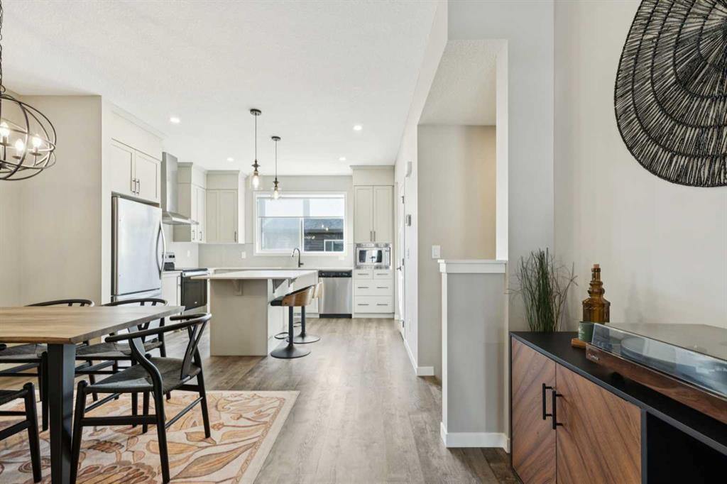 The bright, open-concept main floor is perfect for both everyday living and entertaining. The spacious living area flows seamlessly into the dining space and contemporary kitchen, featuring sleek cabinetry, stainless steel appliances, a modern backsplash, and a large central island with seating. Durable luxury vinyl plank flooring and a neutral colour palette create a warm, modern feel throughout.