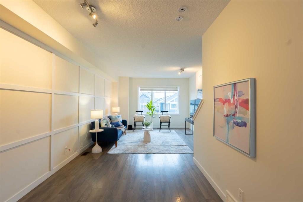Upstairs, carpeted stairs lead to a stunning main living area filled with natural light. Expansive, nearly full-width windows flood the space, highlighting the beautiful accent wall that adds warmth and character to both the living and dining areas. The open-concept design creates an inviting atmosphere perfect for entertaining or relaxing.