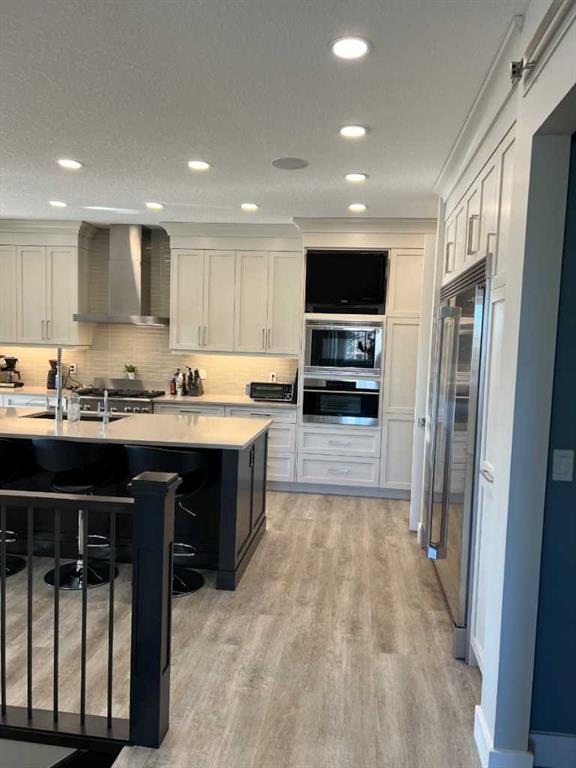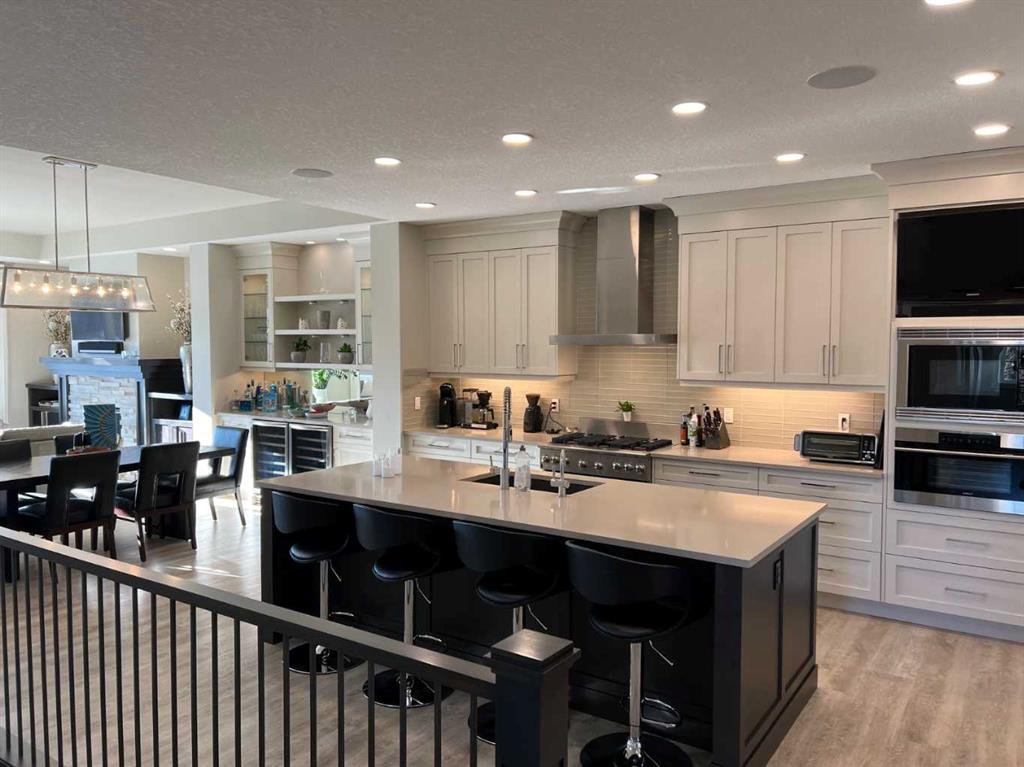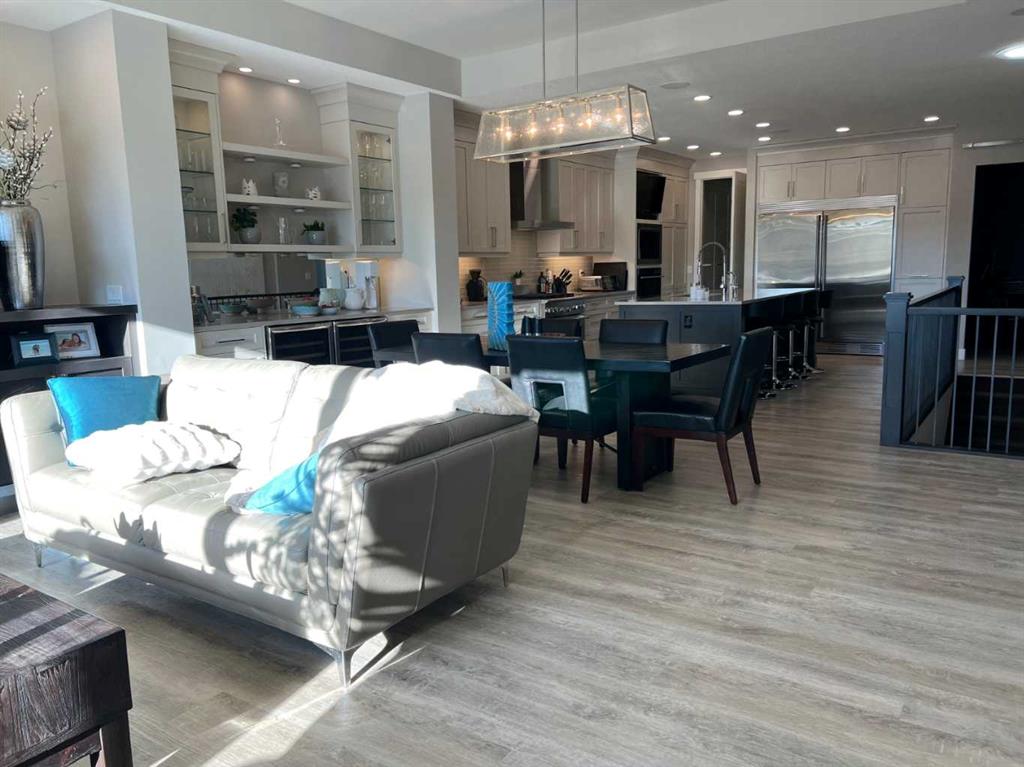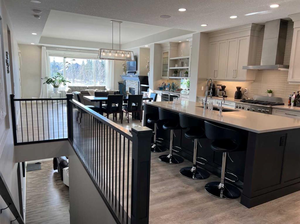 Click Brochure Link for more details. A rare opportunity to own one of the most desirable estate villas in the lock & leave community of Swift Creek Estates, within the prestigious community of Elbow Valley. The last comparable (over a year ago) sold in days - and none have come to market since. Built in 2019 and exceptionally lightly lived in, this move-in ready walkout bungalow offers the largest floorplan with almost 3000 sqft fully developed, the largest garage, and sits on one of the largest lots (.15 acre) in the community. Positioned on a premium south-facing end lot, the home captures both morning sunrises and evening sunsets, surrounded by the beautiful Elbow Springs golf course and Fisherman’s Lake. $200k in carefully selected upgrades elevate the home well beyond the original builder spec. 10 & 9’ ceilings, upgraded flooring, designer fixtures, extensive custom millwork, and built-in home audio with a multi-zone in ceiling SONOS system create a refined yet extremely comfortable living environment. The kitchen features quartz countertops and an upgraded premium stainless steel appliance pkg with a Wolf steam oven, 36” dual fuel range, full-size fridge and freezer, convection microwave, custom pull-out pantry tower, and extensive full-height cabinetry. The dining area showcases built-in glass cabinetry with dual wine fridges, while the lower level offers a fully appointed wet bar with a custom decorative wine wall, built-in glass cabinetry & beverage fridge — ideal for entertaining. The spa-inspired steam shower is complemented by an RO & remin system with dechlorinated water & softene. The on-demand under sink system provides both hot & cold water and the laundry/mudroom contains sink as well as steam washer & steam dryer. The lower level bedrooms feature custom millwork and both family room & rec room boast fireplaces with custom millwork with mesh-cabinetry and hidden electrical for audio components. Built-in mirrors and art niches throughout. Central A/C as well as full-power screens on the upper deck create a true 3-season outdoor living space. The oversized, heated double garage is a standout feature, complete with hot & cold water, dog wash station, full ProSlat wall system, and commercial-grade shelving & can easily accommodate a lift for car enthusiasts. Professionally landscaped with the addition of 27 trees & 55 shrubs, as well as upgraded wifi smart-watering irrigation, the property offers both privacy & beauty. Security is thoughtfully addressed with home monitoring as well as the on-site manned community security — ideal for a lock-and-leave lifestyle.