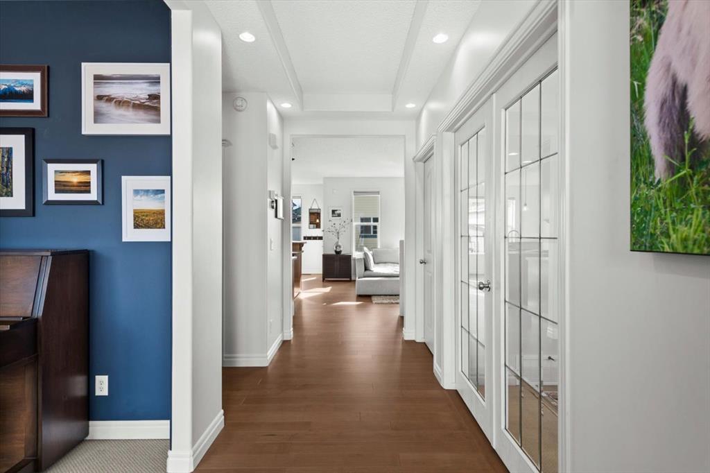 Are you looking for a detached house with a large yard, across from a park and minutes from shopping? What about a great family home with dual office/dens on the main floor, a newer roof and a covered veranda? Over 2700sqf of air-conditioned developed space over 3 levels means you have all the space for a growing family. Entering the home, on the left side you will find a den that is perfect for a music room or kids’ playroom. Across the hall through the French doors, a great home office overlooking the veranda and the park. Newer hardwood stretches past the private powder room and into the rest of the main living area. The warm kitchen has upgraded stainless steel appliances, a two-tier island and plenty of counter space – plus a corner pantry and garburator. The open concept layout is perfect for entertaining or making meals while being able to supervise kids in the SE/SW facing yard or while they are preoccupied with their favourite TV show. Enjoy bright sunshine from numerous windows along the rear of the house, cozy evenings in front of the gas fireplace and make family dinners count in the attached dining room. Spend summers outside on the patio with sun all day, and plenty of space for activities. Need a little break? The kids can head to the park across the street, and with a side entrance to the yard – be able to check in where you are enjoying evening sips. Upstairs, the owners retreat lies behind French doors and overlooks the yard. The large ensuite presents dual vanities, soaker tub, stand up shower, water closet, and a walk-in closet. This level is complete with two additional bedrooms and a 4-piece bathroom. The lower level is an extension of the entertaining space, and is perfectly set up for movie nights, a home gym and the cutest built-in playhouse. Kid and grandkid approved. You will also find another bedroom and a 4-piece bathroom here. There is storage a plenty with both a laundry/storage room, and cold storage room. The oversized heated garage also is ready for your electric car with 220v plug, and attic storage accessed via ladder – plus a storage shed just off the garage entrance. This home is well maintained and perfectly located minutes from shopping, the splash park and access to the Deerfoot. Contact your trusted agent to book a showing before She Gon’!
