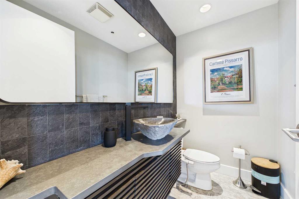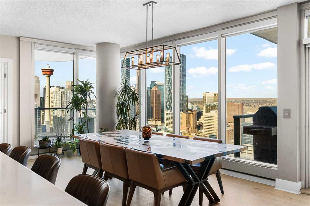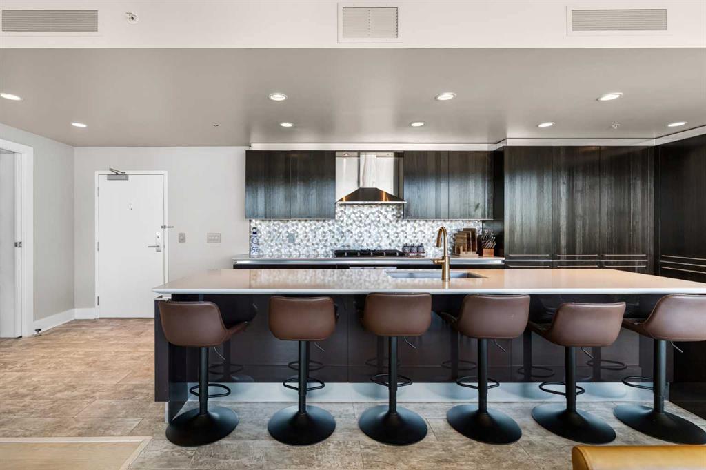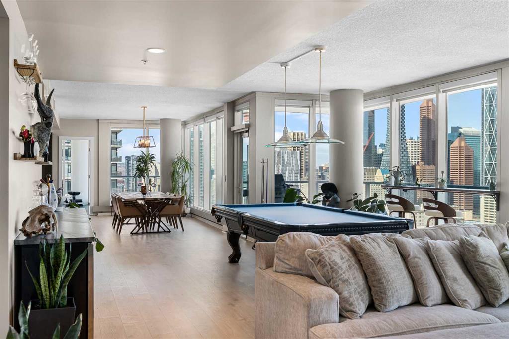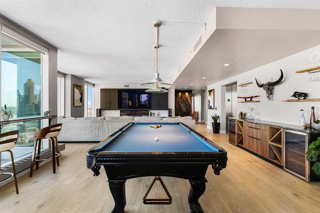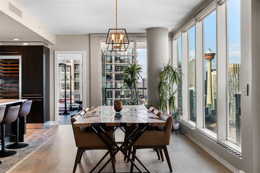 Your day begins with the soft glow of the morning sun spilling through floor-to-ceiling windows, offering panoramic views of downtown Calgary from every room. After a workout in your private home gym, you enjoy breakfast at the leathered granite counter perfectly positioned by the window to take in the city skyline. This 2,600+ sq ft sanctuary is a masterclass in executive hosting; as evening nears, the gentle trickle of the custom stone waterfall sets the mood while you select a vintage from your full-size, dual-zone wine fridge. Whether you are preparing drinks at the sophisticated leathered granite dry bar or a gourmet meal using the suite\'s high-end appliances, the space flows effortlessly for any occasion. The layout offers unmatched privacy with two spacious primary bedrooms, each featuring its own ensuite—including a lavish 5-piece spa retreat in the main suite. When you’re ready to head out, your private elevator opens directly into your suite, whisking you down to the vibrant pulse of the Beltline. You are perfectly positioned in the new Entertainment District, just steps from the new Calgary Flames arena, Stampede grounds, and river pathways. Living at the Arriva means effortless luxury, supported by 24-hour security and concierge services, a rooftop garden, owner’s lounge, guest suites, and central A/C—all complemented by modern updates including a new washer and ventless dryer.