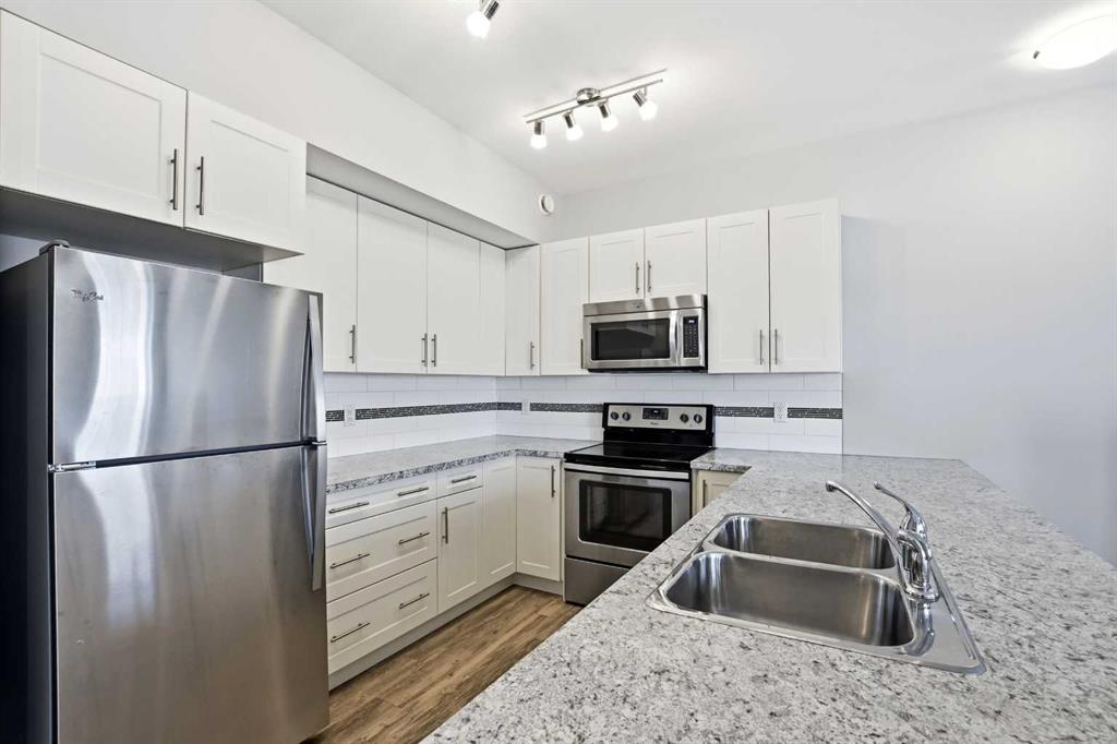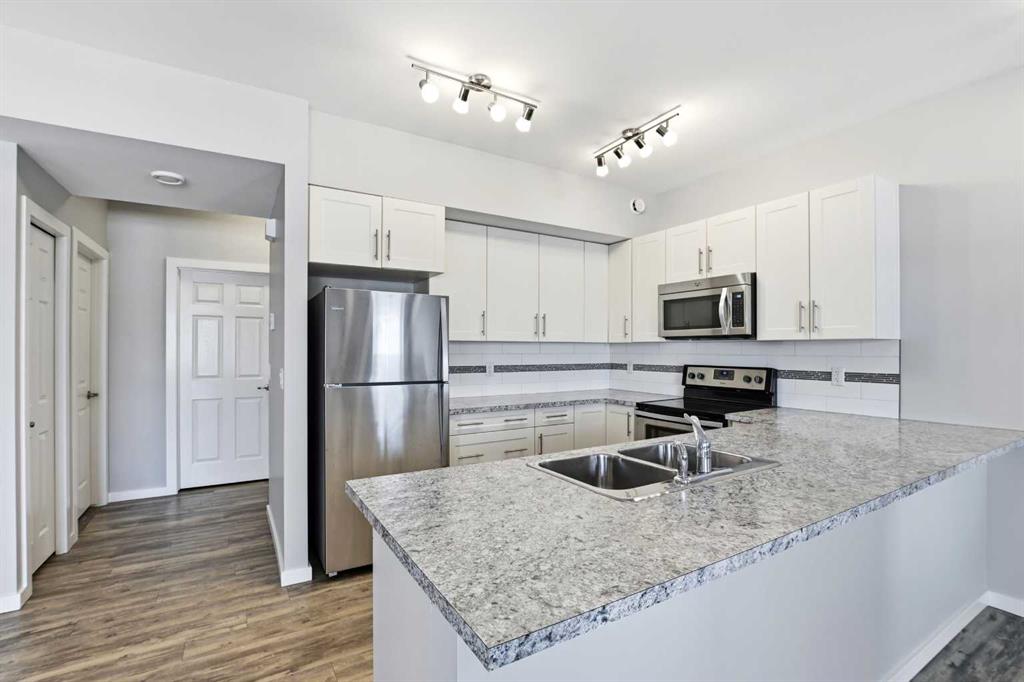 UPPER LEVEL condo in the popular VALLEY CROSSING development. Pull into one of your 2 ASSIGNED POWERED PARKING STALLS right in front of your front door. Once on the main living level - you\'ll fall in love with the OPEN CONCEPT KITCHEN & LIVING AREA with a large peninsula perfect for entertaining guests or just appreciating the tons of counter space you have for meal preparation or baking. The living area opens out to the COVERED NORTH/EAST FACING DECK. Back inside is 2 good sized BEDROOMS including the primary and ENSUITE WITH UPGRADED SHOWER. There\'s another full bathroom as well as IN-SUITE LAUNDRY. Come check it out!! It\'s easy to find because it\'s right beside the Abbey Center, walking trails and shopping and has quick access to both Hwy 2 and Hwy 2A.