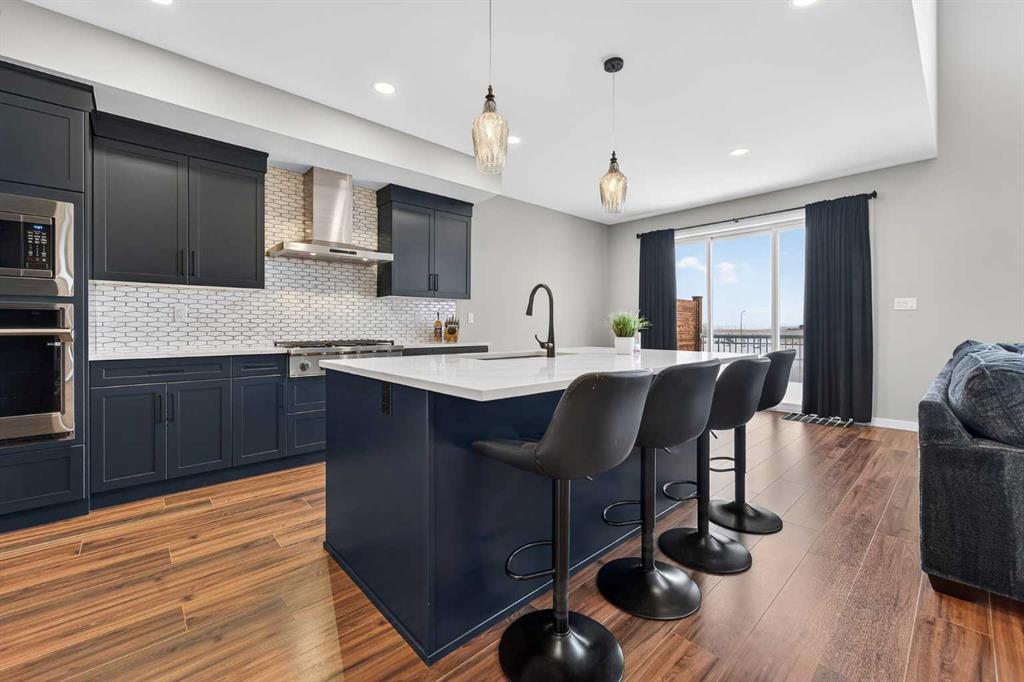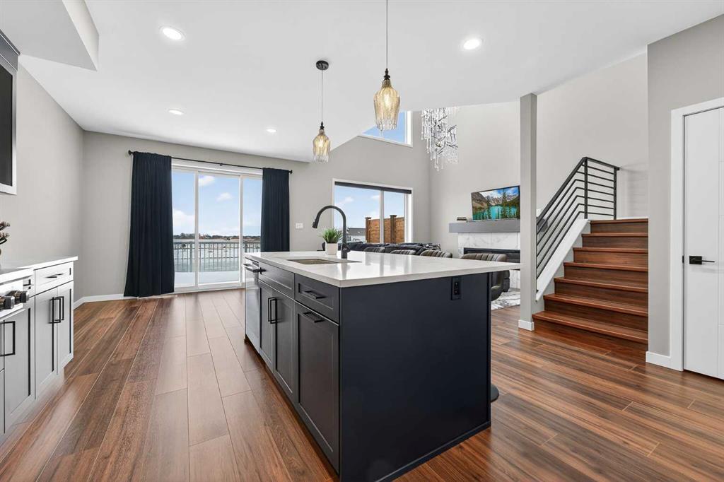Step inside and the first thing you’ll notice is the dramatic open-to-above living room filled with natural light and framed by expansive windows overlooking the pond. A striking chandelier anchors the space, adding just the right amount of sophistication to the airy design. The main floor office offers flexibility for remote work or a quiet retreat.