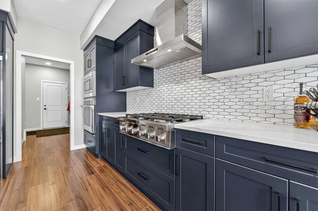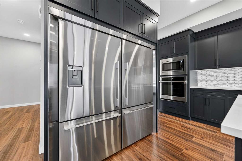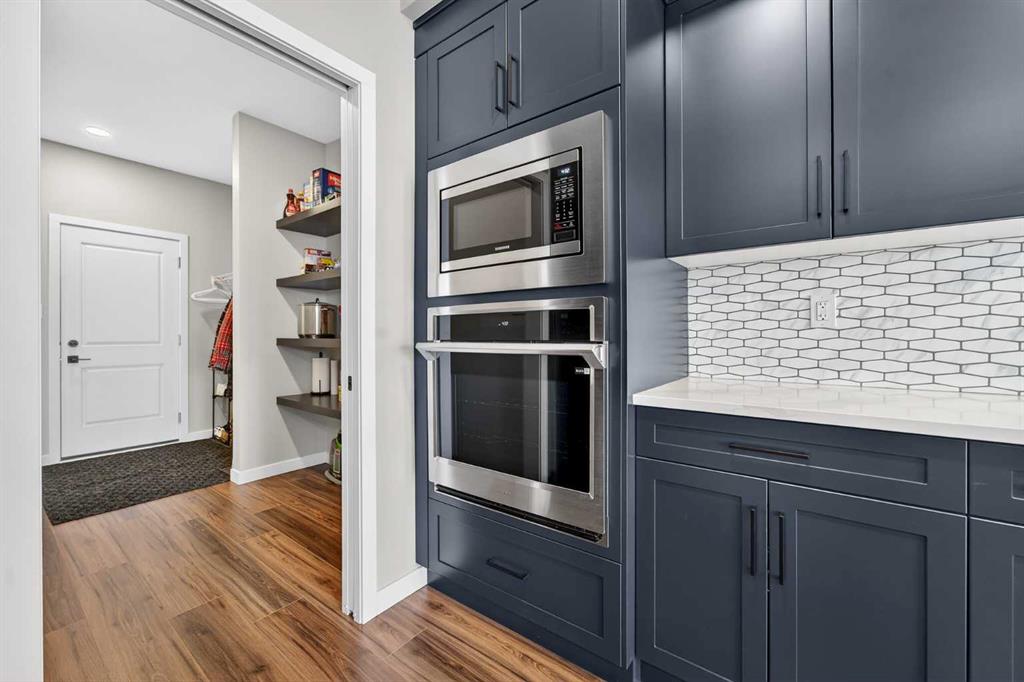 The kitchen is elevated well beyond builder standard. It features upgraded quartz countertops with elegant veining, a dual-door fridge and freezer combo, built-in oven and microwave, and a statement Bertazzoni gas range. The walk-through pantry includes upgraded shelving and connects seamlessly to the mudroom and the oversized double garage, which has been extended two feet on each side for extra breathing room.