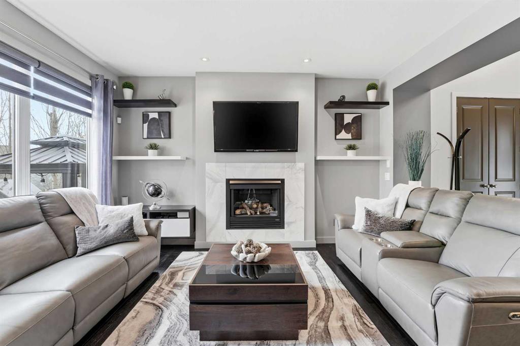 The main level features an open-concept layout with hardwood flooring and a tiled entry. The kitchen offers abundant cabinetry, generous counter space, a gas stove, walk-through door leading to the pantry and garage. Seamless flow into the dining and living areas — ideal for everyday living and entertaining. A tile-surround gas fireplace with built-in shelving anchors the living room, creating a warm and inviting focal point. A convenient 2-piece bathroom completes the main floor, and patio doors off the dining area lead directly to the backyard.