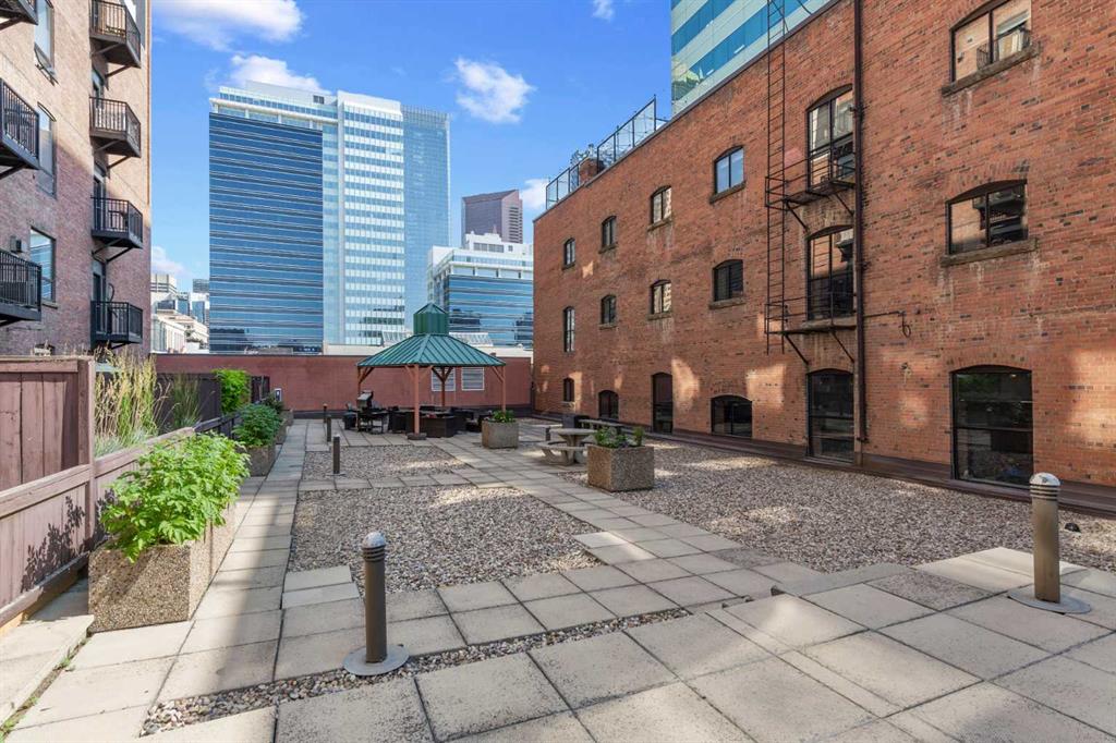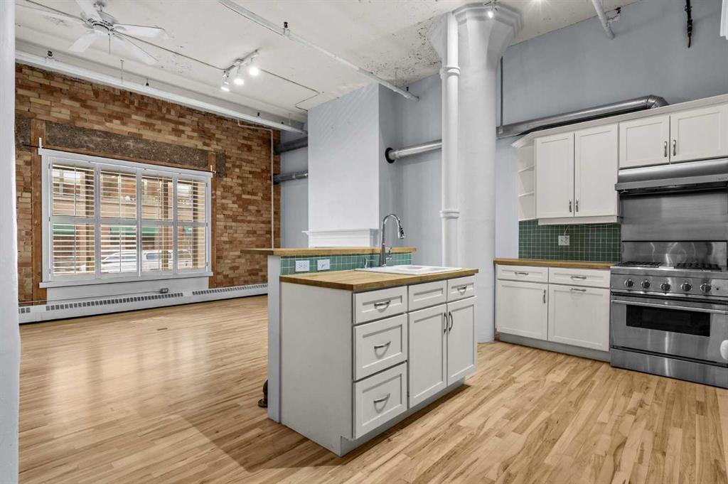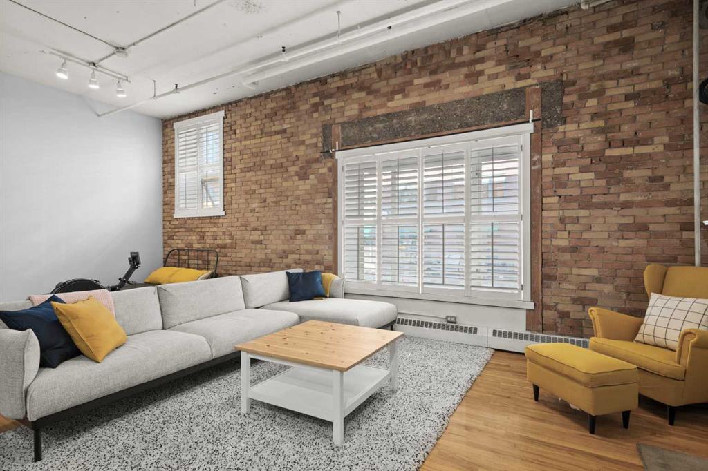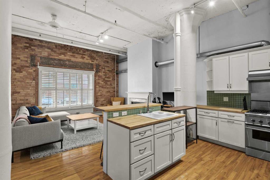 Welcome to the Lewis Loft Building, a historic gem nestled in the vibrant Beltline district of Downtown Calgary. This stunning unit boasts an open layout that seamlessly combines modern luxury with vintage charm. Hardwood floors and soaring high ceilings complement the exposed brick walls, creating an inviting and spacious atmosphere. The kitchen features stainless steel appliances, gas range, and striking butcher block countertops. A breakfast bar and ample cupboard space make this kitchen as functional as it is stylish. The living room is a cozy retreat with a large window that floods the space with natural light and a gas fireplace that adds a touch of warmth and elegance. Convenience is key with in-suite laundry, underground heated parking ( #45), and an additional storage locker (#56). Note the exceptional roof top retreat/patio area just one floor above. Attention to detail and meticulous care of this unit includes … Floors - repaired, sanded and refinished (January), ceiling painted (March), unit painted (2022), cabinets refinished (2024), wash/dryer (2022).