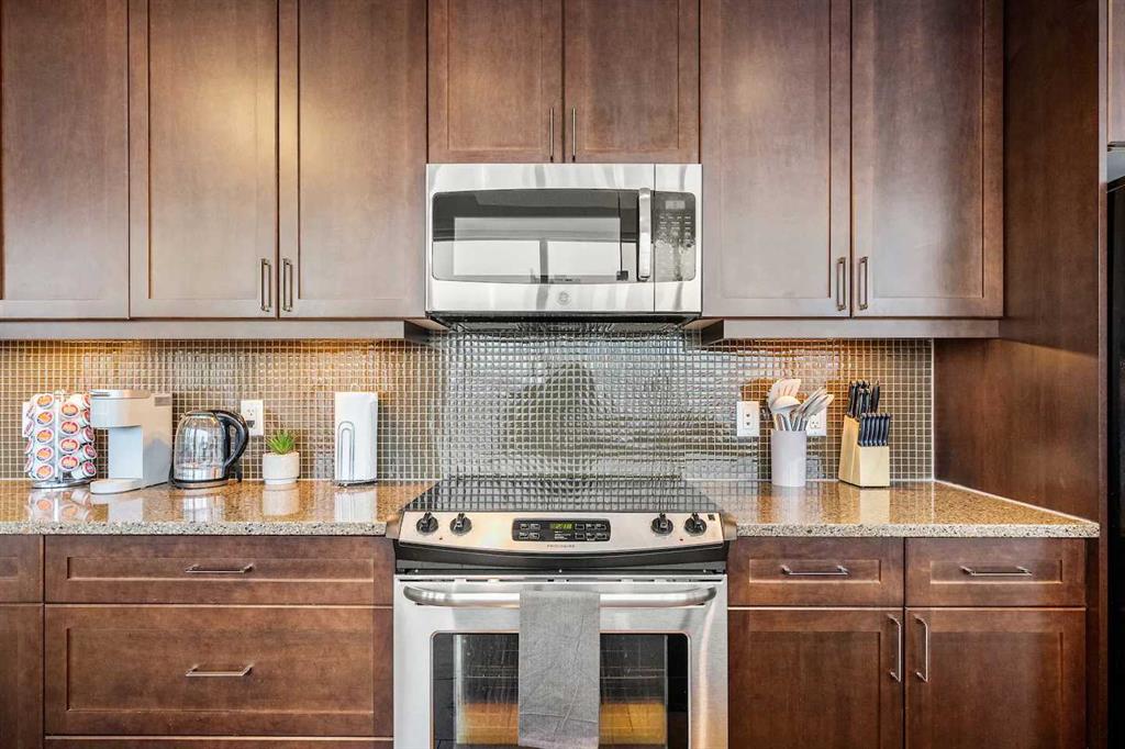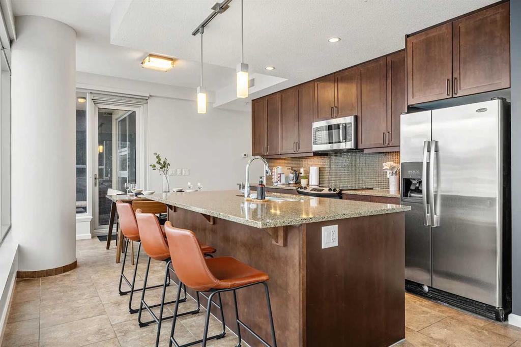 Experience Elevated Urban Living at Nuera! Step into sophisticated city living in one of Victoria Park’s most coveted buildings—Nuera. This stunning corner unit offers uninterrupted views of downtown Calgary, including the iconic Calgary Tower, through dramatic floor-to-ceiling windows and soaring 9-foot ceilings that flood the space with natural light from the west facing windows. Designed with both style and function in mind, this expansive 2-bedroom, 2-bathroom residence is the perfect blend of modern luxury and everyday comfort. The chef-inspired kitchen is the heart of the home, featuring sleek granite countertops, stainless-steel appliances, rich cabinetry, and a breakfast bar—ideal for entertaining or casual dining. The open-concept layout flows effortlessly from the kitchen to the designated dining area and bright, inviting living room, which opens onto a spacious private balcony with panoramic city views. The primary suite is a true retreat, complete with a generous walk-through closet with dual sides and a well-appointed 4pc ensuite. The second bedroom is thoughtfully positioned on the opposite end of the unit for optimal privacy—perfect for guests or a home office—and is paired with a stylish 3-piece bathroom just steps away. Additional features include in-suite laundry, a titled underground parking stall, secure storage, bike storage, and access to a state-of-the-art fitness centre. The building also offers the peace of mind of full-time security, concierge service, and underground visitor parking. All this in a prime location—just steps to the downtown core, C-Train, Sunterra Market, and the vibrant energy of 17th Avenue’s dining and boutique scene. Luxury. Convenience. Location. This is city living at its finest. Book your private showing today!