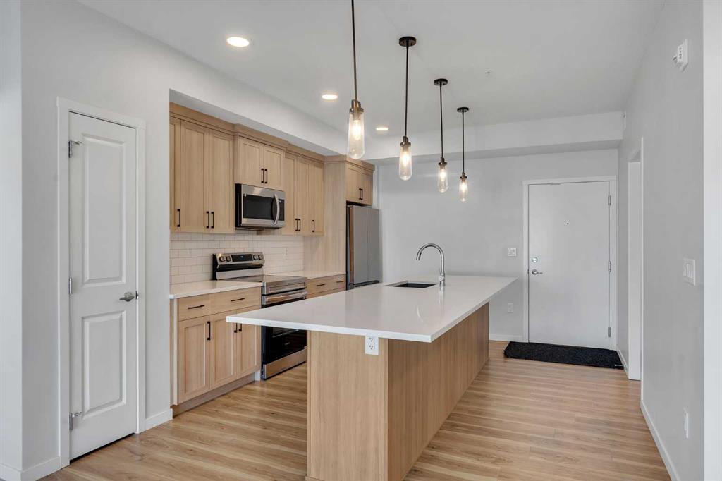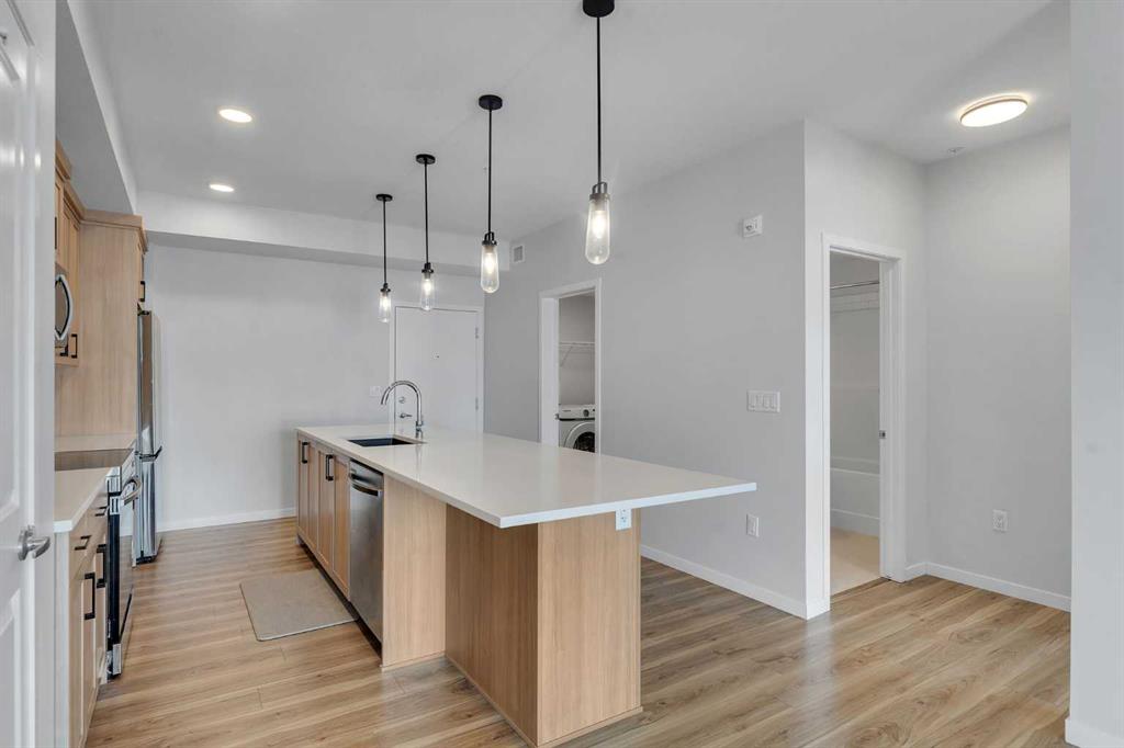 Step into modern living with this beautifully designed 2-bedroom, 2 bath rooms, ensuite laundry and storage area, This condo featuring a bright, open floor plan and stylish contemporary finishes throughout. The spacious kitchen is the heart of the home, showcasing a huge island perfect for entertaining, quartz countertops, stainless steel appliances, and ample cabinetry to keep everything organized. Durable vinyl plank flooring flows seamlessly through the main living areas, creating a warm and cohesive feel. The primary suite offers a private retreat complete with a walk-in closet and a luxurious 4-piece ensuite featuring a double vanity. A generously sized second bedroom provides flexibility for guests, a home office, or additional living space. You’ll also appreciate the rare bonus of a large laundry room with extra storage potential. Enjoy the convenience and security of titled underground parking stall #102, along with the low-maintenance lifestyle this modern condo provides. Ideal for professionals, downsizers, or investors, this home combines comfort, function, and contemporary design in one exceptional package. Quick Possession available, Call your favorite realtor now to view it This !!