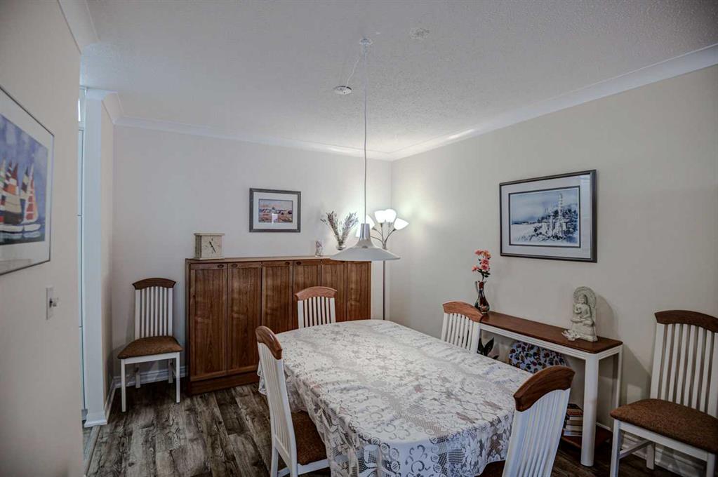 Quiet, 40+ age restricted living can be yours in Chinook Manor, a well-managed and maintained five storey concrete building, with elevator, that is only a couple of blocks from Chinook Center. The spacious two-bedroom unit offers 993 square feet of living space and literally needs no work. Just move in and enjoy. This home is freshly painted throughout. along with all brand-new vinyl plank flooring . Large open living room dining room combination with crown moulding overlooking your exclusive use patio. Second bedroom can be used as an office. The Murphy bed is included.The full bath has a newer vanity. In-unit laundry and storage room.There is also a separate assigned storage room locker . Amenities Include a social room, billiard room, fitness room, laundry room and hobby workshop room. The available underground parking is an option, subject to availability, over and above the building’s included surface parking and abundant on-street parking. There is a strict no-pet policy here and respectable condo fees of $604 per month. Enjoy the quiet lifestyle.Close to transportation and all types of shopping and restaurants.