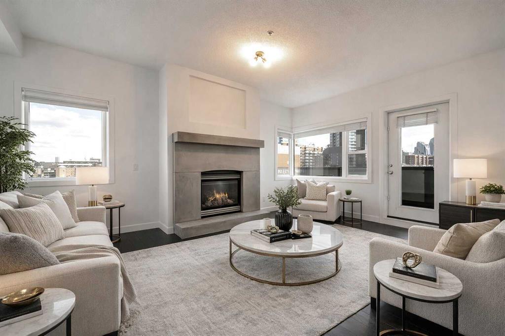 Incredible value in this stylish, urban chic, two bedroom condo, perfectly located in Lower Mount Royal! This lovely unit offers a bright, open plan, completely refreshed in a neutral palette and complimented by contemporary finishings throughout. The kitchen provides a sophisticated, yet functional vibe and includes granite counters, stainless appliances, large pantry and opens to a comfortable living/dining room with striking, concrete gas fireplace. The master bedroom comes complete with a large 4 piece ensuite bath and walk-in closet. The second bedroom is located on the opposite side of the unit, providing privacy and ease of access to main bath. Enjoy a spacious, NE facing balcony with spectacular downtown views, convenient in-suite laundry, luxurious in-floor heating, a huge, designated storage locker and one titled, underground parking stall. Inner city living at its best! Just steps to shopping, restaurants, transit and quick walk to the downtown. Welcome home!