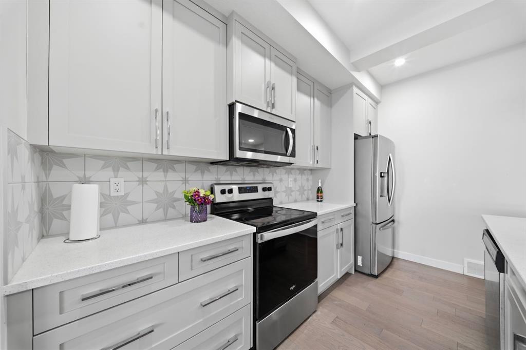Additional highlights include a smart thermostat, electric range, over-the-range microwave hood fan, quartz countertops and a functional, well-planned layout throughout.