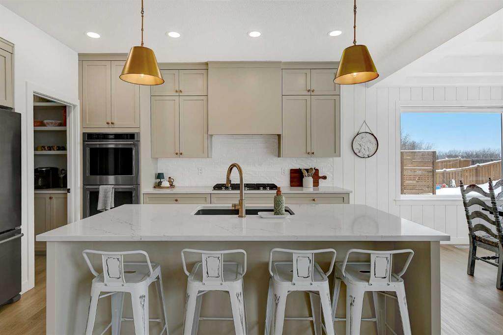 The bright open-concept main floor is filled with natural light and showcases a chef-inspired kitchen complete with an oversized quartz island, 36” gas cooktop, double wall ovens, and a convenient butler’s pantry. The seamless flow into the dining and living areas creates an ideal space for both everyday living and entertaining. A dedicated mudroom and walk-through pantry from the garage add practical convenience.