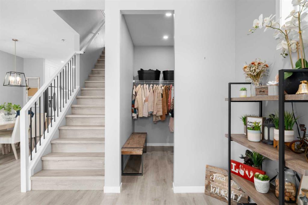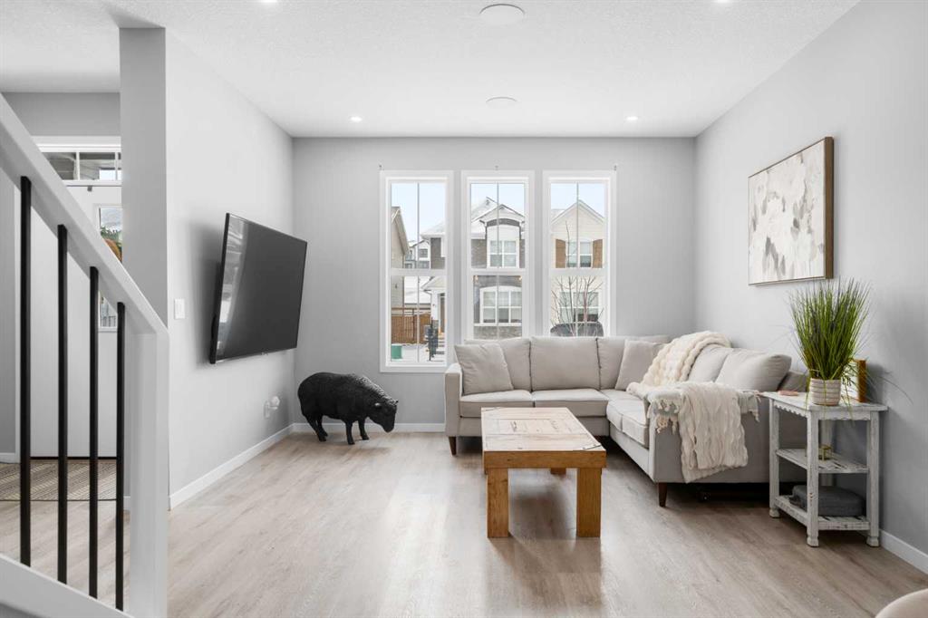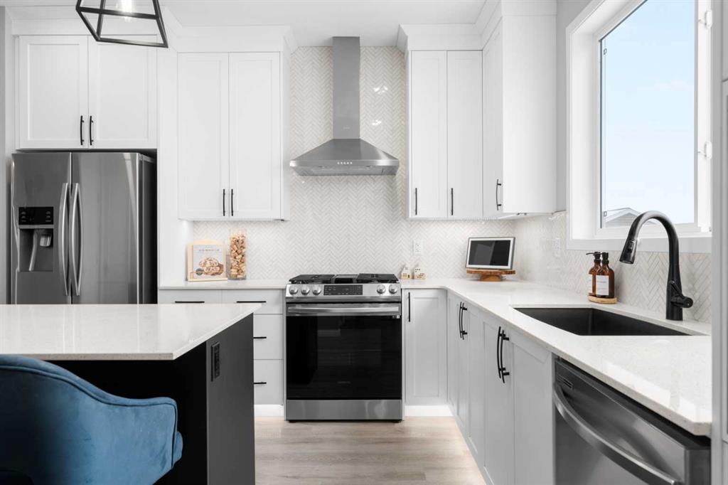Modern living in a quiet, family-friendly neighborhood. Massive front entry closet and spacious foyer welcome you into this open-concept home, with a bright front living room just off the entrance. Large front windows fill the space with natural light, and there’s plenty of room for a cozy sectional. Dining area comfortably accommodates a large table—perfect for hosting family and friends. Kitchen features full-height, timeless white cabinetry, quartz countertops, an island with an eat-up bar, stainless steel appliances (including a fridge with water and ice), a gas stove, under-cabinet lighting, and built-in speakers. Durable, LVP flooring is through out main and upper level. At the back entrance, a functional mudroom with bench and coat hooks leads to the sunny, south-facing backyard. Convenient 2-piece bath is tucked just beside back mudroom. Fully fenced yard is complete with sod, and a gravel parking pad offers space for your future dream garage. There’s also ample street parking out front. Upstairs begins with the convenience of upper-level laundry. Spacious primary bedroom easily fits a king-size bed and features built-in speakers, a walk-in closet, and a 3-piece ensuite with a stand-up shower. Two additional bedrooms are located at the back of the home, along with a 4-piece bath with a shower/tub combination. Both upper bathrooms have quartz counter tops and white cabinets matching the flow of the home. Basement is undeveloped offering space for a fourth bedroom, rec area, and storage and also has rough-in plumbing. Best of all—no condo fees on these units. This beautiful home is far enough away from main roads where it is quiet but a short walking distance to grocery stores, restaurants and shops.