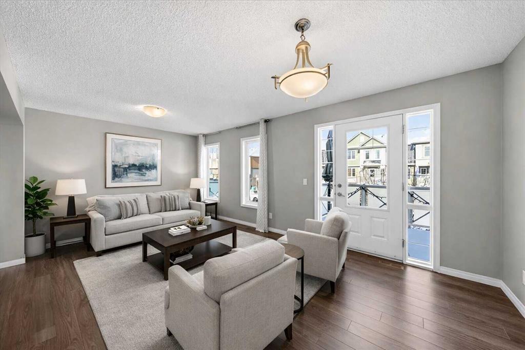 The main level offers a bright, open-concept layout with durable laminate flooring, a spacious living room filled with natural light, and a dining area that leads directly to your private balcony.