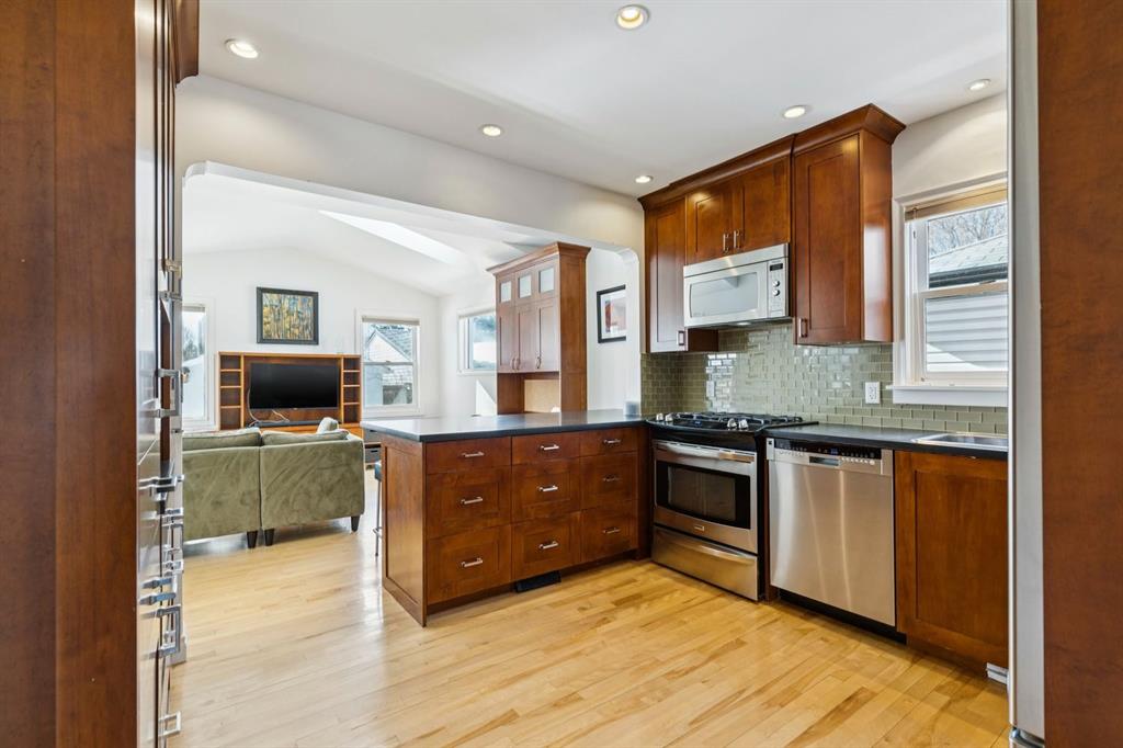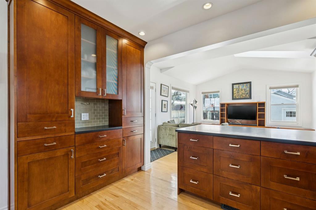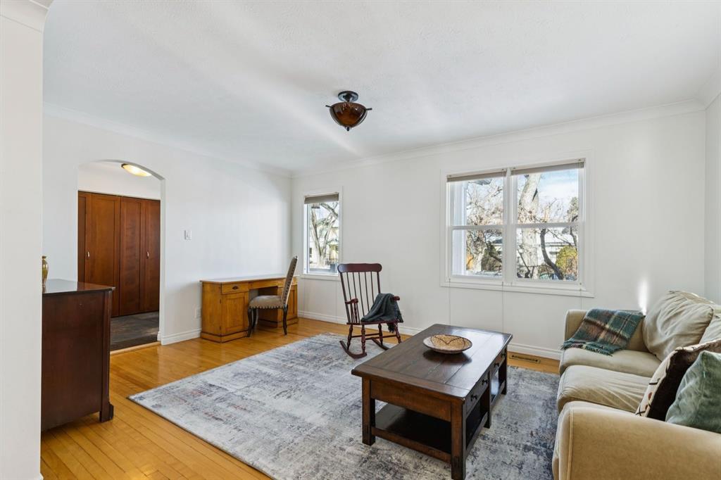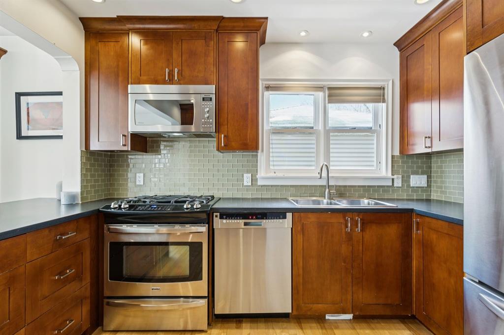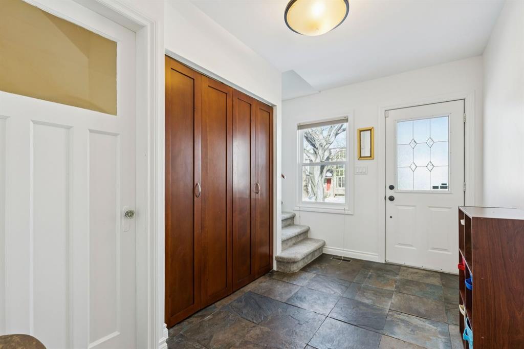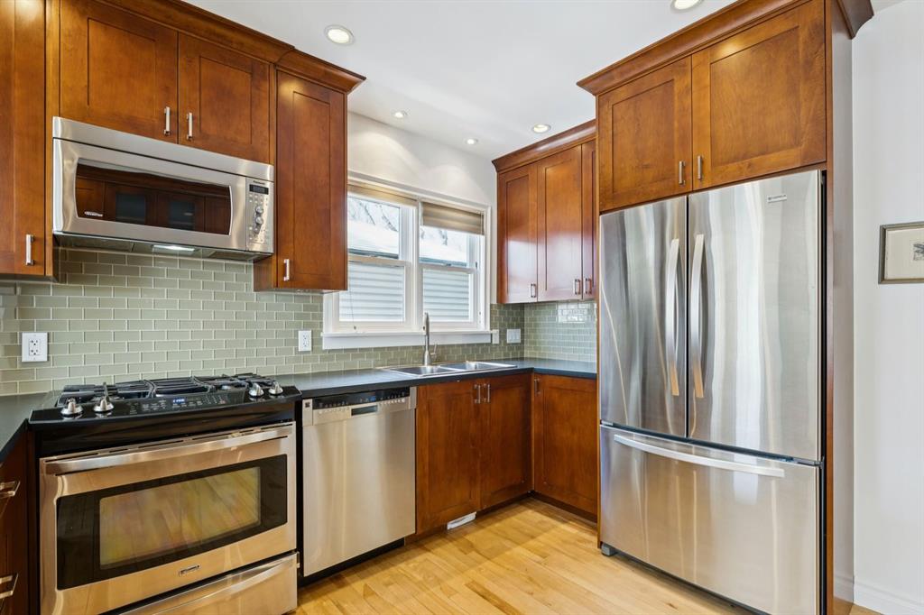 Tucked away on a quiet, tree lined street in a prime central location, this rare and charming home sits on a 41\' lot and offers the perfect blend of character, comfort, and extensive modern renovations. From the moment you arrive, the beautiful curb appeal draws you in with a brick walkway and welcoming front porch, setting the tone for what awaits inside. A spacious slate tiled foyer opens to hardwood floors throughout the main level, where the bright and inviting living room features elegant archways leading to the dining room and french doors that open onto a large rear deck, thoughtfully designed around a mature tree to preserve nature and enhance the serene setting. The modern kitchen showcases rich cherry cabinetry, laminate counters, a glass tile backsplash, eat up peninsula, and stainless steel appliances, including a gas stove, making it both stylish and functional. A stunning family room boasts vaulted ceilings, a skylight, custom built-in media centre, built-in desk, and walls of windows that flood the space with natural light while providing direct access to the expansive south facing backyard and deck. Upstairs, plush carpet leads to three bedrooms including a spectacular primary retreat featuring a corner gas fireplace, large windows, and its own skylight. The luxurious 5pc ensuite offers a jetted tub, heated floors, glass enclosed shower with rainfall shower head, dual closets, and an abundance of natural light. The other two bedrooms share a modern 3pc bath and a convenient stacked laundry area complete the upper level. The lower level offers a separate entrance and presents cork tile flooring, a massive storage area with cold room, and spacious rec room with another corner gas fireplace. A fourth bedroom currently designed as a home office, and an additional 3pc bathroom finish the lower level offering a great space for families. Additional highlights include a tankless hot water, a Home nuvoH2O water softening system, and a large south exposed backyard with mature trees, garden space, green lawn, brick pathway to the single detached garage, and an additional shed. Located in the highly sought after Mount Pleasant community, residents enjoy a vibrant inner city lifestyle with easy access to downtown, schools, parks, playgrounds, public transit, and the Mount Pleasant Community Sportsplex, along with trendy cafés and local shops, all while benefiting from the charm and tranquility of a well established neighbourhood. Come see this gem and get ready to make this house your \"home.\"