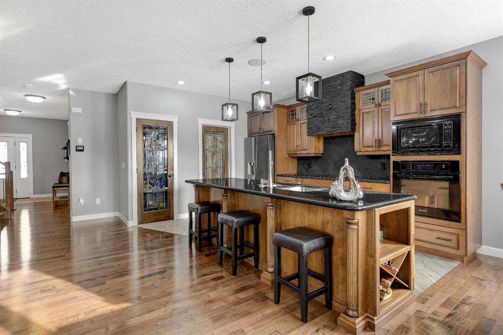 Welcome to this exceptional custom-built Maple Ridge home offering 5 bedrooms and 3.5 bathrooms. Perfectly situated on a beautifully treed 0.86-acre lot in a quiet cul-de-sac surrounded by walking trails and a welcoming, family-oriented community. This 2531 sqft 2 storey was built for both elevated living and everyday practicality. Thoughtfully designed home featuring 9-foot ceilings on the main and lower levels, in-floor heating with multiple zones, a high-efficiency furnace, Navien combi system, Cat 5 wiring, architectural exterior lighting and quality craftsmanship throughout. The chef-inspired kitchen is both elegant and functional, showcasing granite countertops, custom Lafleur real maple cabinetry with soft-close doors, hidden spice racks, glass display accents, eating bar, undermount sink with touchless faucet, induction cooktop, wall oven, and newer appliances, all complemented by updated herringbone tile. The inviting great room with gas fireplace, hardwood floors and french doors creates a warm yet refined gathering space, while a soundproofed media room, central vacuum, central air and custom closet built-ins add comfort and convenience. The spacious primary bedroom offers a retreat of its own with a gas fireplace, beautiful natural light, a spa-like ensuite with dual vanities, fully tiled glass shower, and relaxing soaker tub. Outdoors, enjoy a covered deck, two-season sunroom with natural gas BBQ hookup, firepit, irrigation system, decorative landscape curbing, and mature trees providing privacy and year-round beauty. The triple car attached garage impresses with 14-foot ceilings, 12-foot doors, heated flooring and generous storage, while the remarkable two-storey 34x34 engineered heated shop—complete with 10 & 12-foot doors, bar area, car-lift capability, and upper level bonus room —offers incredible flexibility for hobbies, workspace, or extended family use. With paved access to the house, hard-packed gravel to the shop, and striking curb appeal in every season, this property seamlessly blends luxury, space, and everyday functionality into one extraordinary offering.