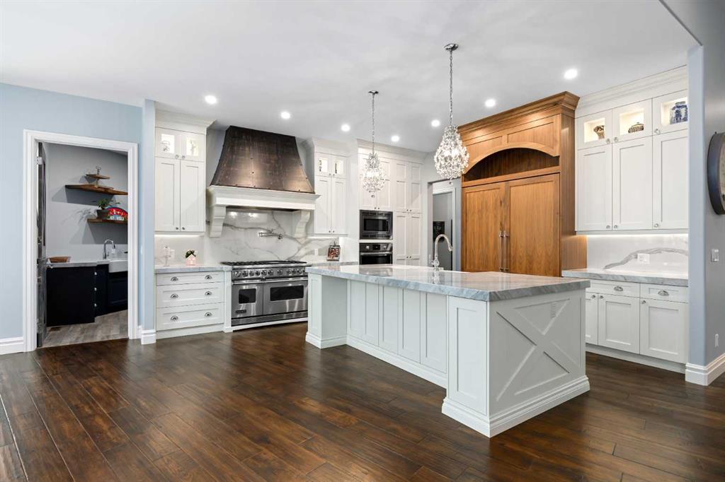 At the heart of the home, the kitchen is both striking and functional. A substantial gas range with grill and copper hood anchors the space, complemented by a built-in wall oven, warming drawer, and full-size refrigerator and freezer wrapped in custom maple-stained cabinetry. The oversized island becomes a natural gathering place, equally suited to quiet morning coffee or elegant entertaining, while a well-appointed butler’s pantry with sink provides additional prep space, generous storage, and seamless flow for hosting.