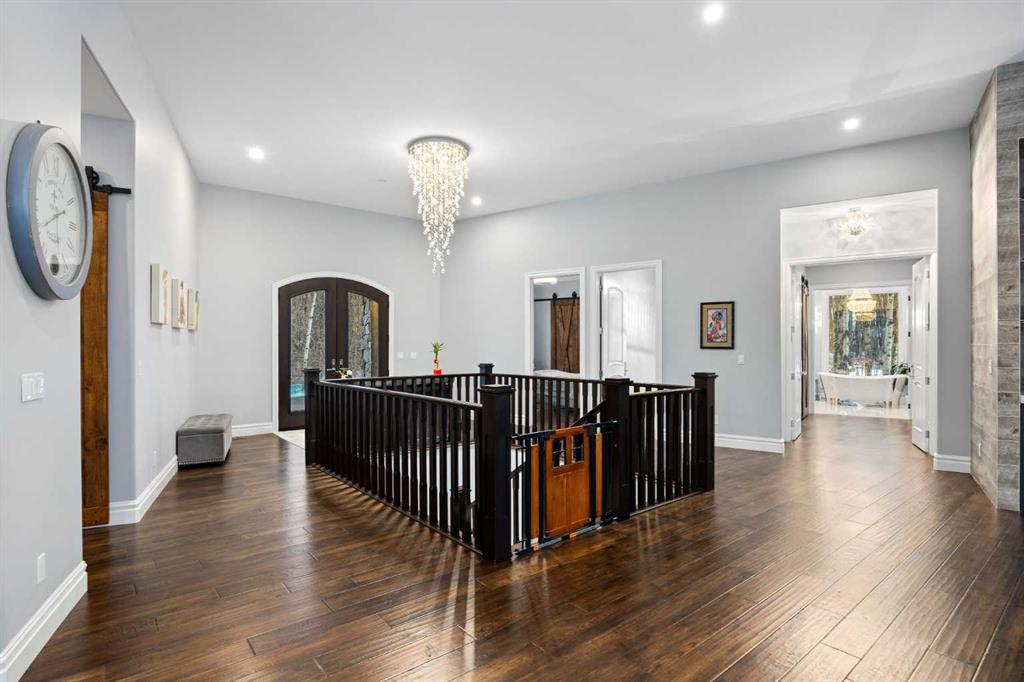 The primary suite offers a retreat within the home. Enter through double doors to a serene space warmed by a gas fireplace framed in sandblasted Italian marble, with windows overlooking the aspen canopy beyond. The ensuite feels reminiscent of a private spa, finished in marble tile with a deep soaker tub beside an oversized picture window, a walk-in glass-enclosed shower, dual vanities, and an expansive walk-in closet with illuminated built-in cabinetry. Direct access to the stunning covered rear deck invites relaxed moments outdoors beneath open prairie skies—an inviting place to unwind and take in the surrounding landscape. The walkout lower level presents an opportunity to expand the estate further, offering ten-foot ceilings, rough-ins for three additional bathrooms, a separate furnace, and access to a stamped concrete patio with pine ceiling and recessed lighting. A dedicated podcast studio is already in place, ideal for entrepreneurs, executives, or creators seeking a private professional space at home.