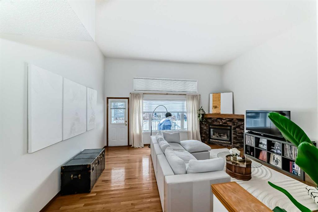 The single attached garage enters into a spacious foyer finished with ceramic tile. Just a few steps up leads to the living room featuring over 12-foot ceilings, creating a spectacular open feel upon entry. The living room includes hardwood flooring, a cozy corner gas fireplace, and patio doors leading to a west-facing deck complete with a gas outlet. The unit backs onto a large shared green space, adding to the sense of openness.