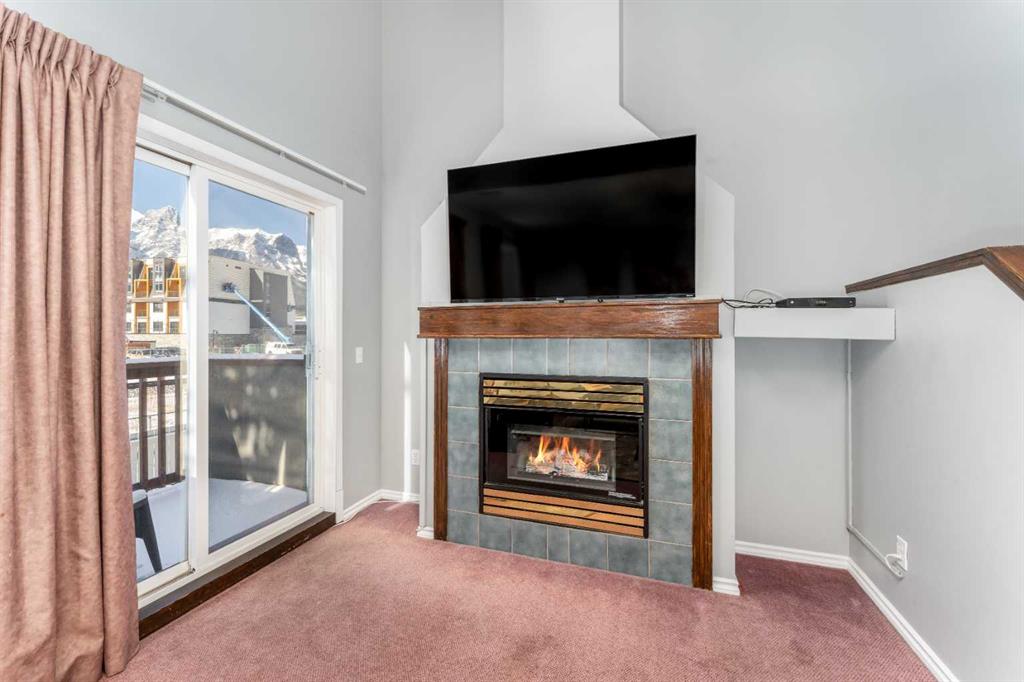 Step onto your private balcony and take in the dramatic Rocky Mountain backdrop, the kind of view guests travel across the world to experience. Inside, the main level features a kitchen with a breakfast bar, a dining area, and a comfortable living room anchored by a cozy gas fireplace, perfect for unwinding after a day on the trails. A convenient 2-piece bath and in-unit laundry complete this level.