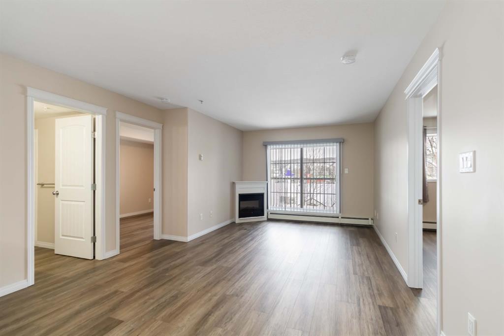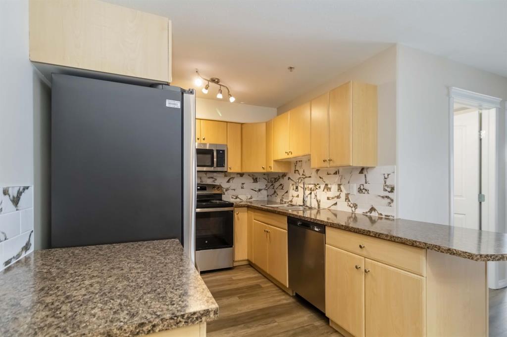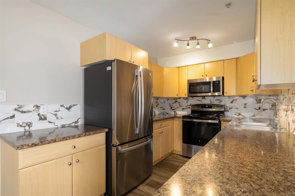 Welcome to this beautifully maintained 2 bedroom, 2 bathroom condo in Rundlestone Estates, a well managed and impeccably clean building centrally located downtown, just steps from shopping, restaurants, schools, walking trails, and more. This open concept unit is located on the same floor as the building’s gym, offering both convenience and accessibility. Inside, you’ll find fresh neutral paint, no carpet, and brand new appliances (Kitchen & Washer/Dryer replaced in 2025), along with a new faucets and thoughtful touches throughout. The kitchen offers ample cabinetry, new appliances, new countertops and backsplash, while the dining area comfortably fits the whole family. The spacious living room features a cozy corner fireplace and access to a private balcony. The primary bedroom includes two closets and a full ensuite, while the second bedroom is privately situated on the opposite side of the unit, adjacent to the second full bathroom perfect for guests or a home office. This unit also comes with one underground parking stall (#310) located just steps from the elevator, plus access to 40+ visitor parking stalls on both the north and south sides of the building. Condo fees include heat and water. This is a rare opportunity to own a move in ready condo that truly has it all. Book your showing today, this one won’t last.