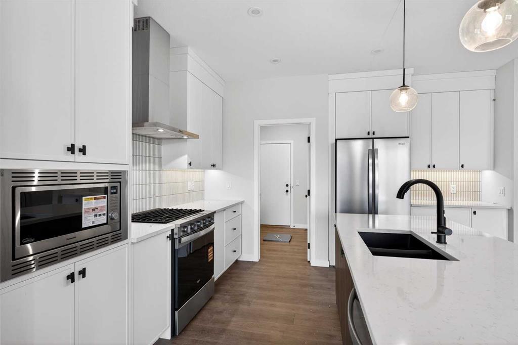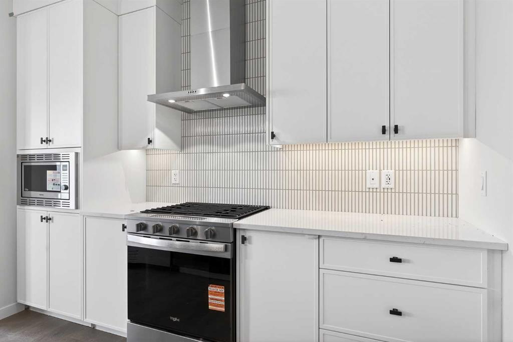 Step inside to a welcoming entry that leads to the heart of the home — a chef-inspired kitchen designed to impress. Features include 42” white ceiling-height cabinetry with crown molding, under-cabinet lighting, quartz countertops, a gas range, built-in microwave, and a stunning chimney hood fan with full-height tile. The stylish island with a Silgranit under-mount sink and a smart 4-bin pullout system keeps everything organized and functional. A walk-in pantry, practical mudroom storage, and a discreet main floor powder room complete the space. The images in this listing show the actual finishes of this great home as well as images of a virtually staged home of the same layout and are marked accordingly.