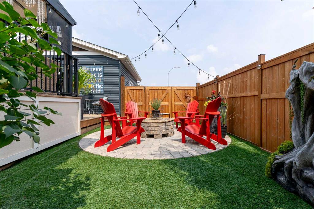 Outside, the fully fenced yard is designed for easy enjoyment. Low maintenance artificial turf eliminates mowing, while an irrigation system services the flowerbeds and planters. Landscape lighting enhances evening ambiance, and a circular gas fire pit creates a natural gathering space. The detached 22\' × 22\' garage features high ceilings, two large windows, 30-amp 120/240-volt service, a 240-volt heater, overhead storage racks, and a built-in workbench, making it ideal for vehicles, hobbies, and storage. The additional gravel parking pad offers excellent flexibility for extra vehicles, a trailer, or RV, with a gate that opens to allow for longer RV parking.