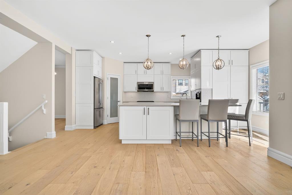 The main level features 9’ ceilings, engineered hardwood flooring, crown mouldings, upgraded doors and hardware, and a stunning gas fireplace with full-height vertical stone facing. The kitchen is both elegant and functional, showcasing full-height cabinetry, granite countertops, a substantial island with built-in table, stainless steel appliances including a Bosch dishwasher, built-in Miele espresso machine, beverage cooler, filtered water outlet, corner pantry, and under-cabinet lighting.