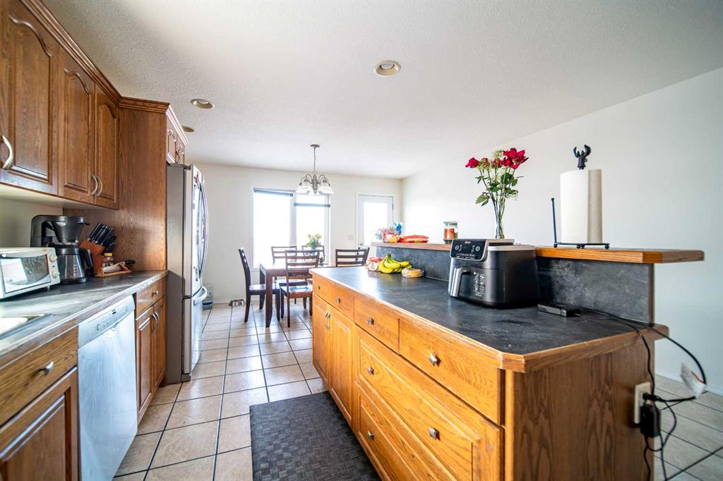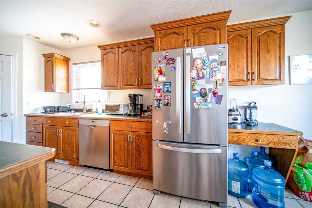 This well-appointed 1,393 sq. ft. bi-level home is situated in a newer subdivision in Edgerton, conveniently located just 20 minutes east of Wainwright, Alberta. Thoughtfully designed for family living, the home offers a practical layout with generous, well-utilized living spaces throughout. The main floor features hardwood flooring in the living room and hallway, complemented by ceramic tile in the entryway, kitchen, and bathrooms. The bright, spacious kitchen is a true highlight, featuring attractive oak cabinetry, a large island, and a comfortable dining area—perfect for both daily living and entertaining. The primary bedroom includes a walk-in closet and a 3-piece ensuite with a jetted tub. Two additional bedrooms and a well-sized 4-piece main bathroom complete the upper level. The fully developed basement provides excellent additional living space with a large games room, family room, office, two more bedrooms, a laundry and storage area, and a plumbed-in bathroom ready for future completion. Outside, the property offers a fenced and landscaped yard, an inviting deck, a double attached garage, and a concrete driveway. Added features include central air conditioning and a garden shed, enhancing both comfort and functionality.